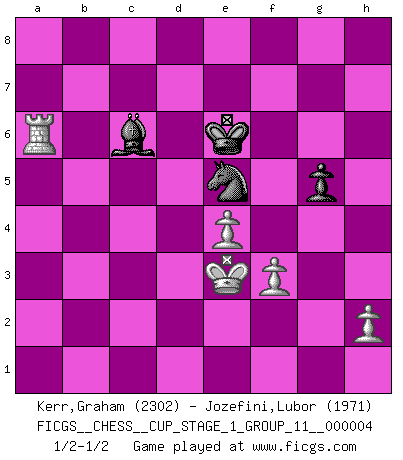 Last move : 1/2-1/2 2021 September 9 14:50:59 [Event "FICGS__CHESS__CUP_STAGE_1_GROUP_11__000004"] [Site "FICGS"] [Date "2021.03.02"] [Round "1"] [White "Kerr,Graham"] [Black "Jozefini,Lubor"] [Result "1/2-1/2"] [WhiteElo "2302"] [BlackElo "1971"] 1.d4 f5 2.Nf3 Nf6 3.g3 g6 4.Bg2 Bg7 5.c4 O-O 6.O-O Na6 7.b3 d6 8.Bb2 c6 9.Nbd2 e5 10.dxe5 Nd7 11.Ba3 Nxe5 12.b4 Qe7 13.Rb1 Nc7 14.b5 c5 15.Nxe5 dxe5 16.Nb3 b6 17.Bxa8 Nxa8 18.Nxc5 bxc5 19.Qd5+ Be6 20.Qxc5 Qf7 21.Rfd1 Nb6 22.Qc6 Re8 23.c5 Nc4 24.Bb4 Bf8 25.b6 Rc8 26.Qa4 axb6 27.cxb6 Nxb6 28.Qa6 Bxb4 29.Rxb4 Nd5 30.Rb7 Qf6 31.Qd6 Nc3 32.Rb8 Qf7 33.Re1 Qe8 34.Rxc8 Qxc8 35.a3 e4 36.Kg2 e3 37.Rc1 f4 38.f3 Qc4 39.Rc2 Bf5 40.Rb2 Bc8 41.Qb4 Qxb4 42.axb4 Bd7 43.Rc2 Nd5 44.b5 Kf7 45.Rb2 Nb6 46.gxf4 Be6 47.Rc2 Nd5 48.Rc6 Bd7 49.Rc5 Ke6 50.b6 Nxb6 51.Re5+ Kd6 52.Rxe3 Nd5 53.Re4 h6 54.Kf2 g5 55.fxg5 hxg5 56.Rd4 Ke5 57.Re4+ Kd6 58.Rc4 Nf6 59.Ke3 Nd5+ 60.Kd2 Nf6 61.e4 Be6 62.Rb4 Nd7 63.Ke3 Ne5 64.Rb7 Bd7 65.Rb6+ Bc6 66.Ra6 Kd7 67.Ra7+ Ke6 68.Ra6 1/2-1/2 Dutch Kingside Castling by player Black (move 5) Kingside Castling by player White (move 6) 10 pieces endgame at move 55 : White KRPPPP , Black KBNP WHITE : King + 1 Rook 4 Pawns BLACK : King + 1 Bishop 1 Knight 1 Pawn 9 pieces endgame at move 55 : White KRPPP , Black KBNP WHITE : King + 1 Rook 3 Pawns BLACK : King + 1 Bishop 1 Knight 1 Pawn This chess game ended in a draw. Follow this game move after move (download)It's just you and your opponent at the board and you're trying to prove something. (Bobby Fischer) Ich spiele ehrlich und spiele, um zu gewinnen. Wenn ich verliere nehme ich meine Medizin. (Robert James Fischer) Fischer deseaba darle a los Rusos una sopa de su propia medicina. (Larry Evans) Il s'avisa de me proposer d'apprendre les échecs qu'il jouait un peu... me voilà forcené des échecs. J'achète un échiquier, je m'enferme dans ma chambre, j'y passe des jours et des nuits à vouloir apprendre par cur toutes les parties. (Jean-Jacques Rousseau, Confessions) Just because you do not take an interest in politics doesn't mean politics won't take an interest in you. (Pericles 430 B.C.)