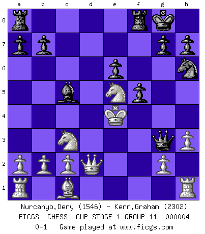 Last move : 0-1 2021 April 5 19:9:44 [Event "FICGS__CHESS__CUP_STAGE_1_GROUP_11__000004"] [Site "FICGS"] [Date "2021.03.02"] [Round "1"] [White "Nurcahyo,Dery"] [Black "Kerr,Graham"] [Result "0-1"] [WhiteElo "1546"] [BlackElo "2302"] 1.e4 c5 2.Ne2 Nf6 3.e5 Ng4 4.f4 d6 5.h3 Nh6 6.d4 cxd4 7.Nxd4 e6 8.Bb5+ Bd7 9.Nc3 dxe5 10.fxe5 Qh4+ 11.Ke2 Bc5 12.Nf3 Qf2+ 13.Kd3 O-O 14.Bxd7 Nxd7 15.Qd2 Nxe5+ 16.Ke4 Qg3 17.Nxe5 f5+ 0-1 Sicilian : Keres variation (2.Ne2) Kingside Castling by player Black (move 13) Player Black won this chess game. Follow this game move after move (download)Any material change in a position must come about by mate, a capture, or a Pawn promotion. (Purdy) Wie ich sie so einen nach dem anderen nieder mähte wurde meine Überlegenheit offensichtlich. (José Raúl Capablanca) Cuando le juegas a Fischer, no es una cuestion de si vas a ganar o perder. Es una cuestion de si vas a sobrevivir. (Boris Spassky) D'abord les bases : Jouez et étudiez, puis étudiez et jouez, ensuite jouez et étudiez, puis étudiez et jouez. Deuxièmement : Donnez toujours le meilleur de vous-même ! (Ken Smith) Memory is a complicated thing, a relative to truth, but not its twin. (Barbara Kingsolver, Animal Dreams)