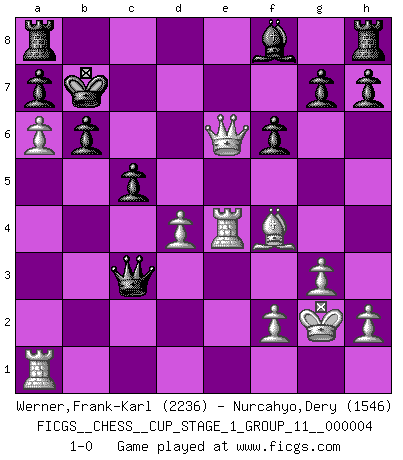 Last move : 1-0 2021 March 29 20:13:22 [Event "FICGS__CHESS__CUP_STAGE_1_GROUP_11__000004"] [Site "FICGS"] [Date "2021.03.02"] [Round "1"] [White "Werner,Frank-Karl"] [Black "Nurcahyo,Dery"] [Result "1-0"] [WhiteElo "2236"] [BlackElo "1546"] 1.c4 b6 2.d4 Nf6 3.Nc3 Bb7 4.Qc2 d5 5.cxd5 Nxd5 6.e4 Nxc3 7.bxc3 e6 8.Nf3 f6 9.Bb5+ c6 10.Bc4 Qe7 11.Qe2 Nd7 12.a4 Qf7 13.Qa2 Qg6 14.O-O c5 15.Bxe6 Bxe4 16.Nh4 Qh5 17.Re1 Qxh4 18.g3 Qh5 19.Rxe4 Qd1+ 20.Kg2 Qd3 21.Bxd7+ Kxd7 22.Qe6+ Kc7 23.Bf4+ Kb7 24.a5 Qxc3 25.a6+ 1-0 English Opening Kingside Castling by player White (move 14) Player White won this chess game. Follow this game move after move (download)I feel as if I were a piece in a game of Chess, when my opponent says of it: That piece cannot be moved. (Soren Kierkegaard) Das Schach hält seine Meister in eigenen Banden, Fesseln; auf vielerlei Weise formt es ihren Geist, so dass die innere Freiheit selbst des Stärksten beeinflusst wird. (Albert Einstein) Aquel que ve no otra dirección en el juego que la de dar Jaque Mate a su oponente, nunca será un buen jugador de Ajedrez. (Euwe) Il n'y a pas de prix trop élevé au scalp de l'ennemi. (Koblentz) Art is the triumph over chaos. (John Cheever)