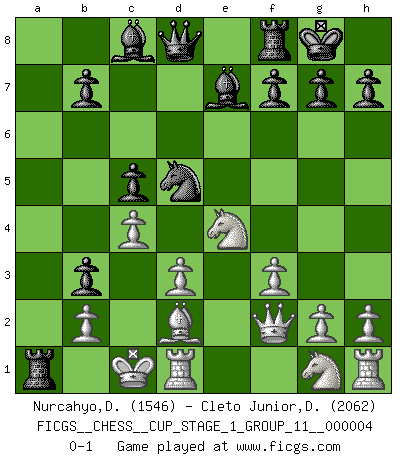 Last move : 0-1 2021 March 22 18:20:48 [Event "FICGS__CHESS__CUP_STAGE_1_GROUP_11__000004"] [Site "FICGS"] [Date "2021.03.02"] [Round "1"] [White "Nurcahyo,Dery"] [Black "Cleto Junior,Dirceu"] [Result "0-1"] [WhiteElo "1546"] [BlackElo "2062"] 1.f3 e5 2.Nc3 Nc6 3.e3 Nf6 4.Bc4 d5 5.Bb3 d4 6.exd4 exd4 7.Qe2+ Be7 8.Ne4 O-O 9.d3 Na5 10.Bd2 Nxb3 11.axb3 Nd5 12.O-O-O a5 13.Qf2 a4 14.Qxd4 c5 15.Qf2 axb3 16.c4 Ra1+ 0-1 Gedult's Opening Kingside Castling by player Black (move 8) Queenside Castling by player White (move 12) Player Black won this chess game. Follow this game move after move (download)It is always better to sacrifice your opponent's men. (Savielly Tartakower) Ich habe die besten Aussichten, den ersten Preis zu gewinnen - denn jeder muss gegen Steinitz spielen, nur ich nicht! (Wilhelm Steinitz) Yo tuve un dolor de muelas en la primer partida. En el segundo juego, tuve un dolor de cabeza. En el tercero, tuve un ataque de reumatísmo. En la cuarta partida, no me sentía muy bien. ¿Y en el quinto juego? Bueno, ¿que acaso uno tiene que ganar todos los juegos?. (Siegbert Tarrasch) On n'a jamais que l'âge auquel on a commence à jouer aux échecs car après on cesse de vieillir. (Capablanca) Crush them ! Make them suffer ! (General Grievous in Star Wars ep.3)