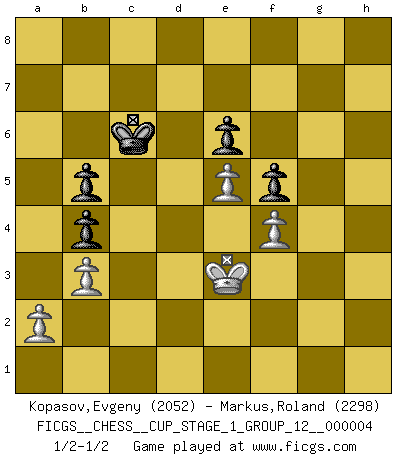 Last move : 1/2-1/2 2021 May 29 23:1:6 [Event "FICGS__CHESS__CUP_STAGE_1_GROUP_12__000004"] [Site "FICGS"] [Date "2021.03.02"] [Round "1"] [White "Kopasov,Evgeny"] [Black "Markus,Roland"] [Result "1/2-1/2"] [WhiteElo "2052"] [BlackElo "2298"] 1.d4 Nf6 2.c4 e6 3.Nc3 Bb4 4.Bd2 c5 5.dxc5 Bxc5 6.Nf3 O-O 7.g3 Qb6 8.e3 Rd8 9.Bg2 Be7 10.O-O Nc6 11.Qb3 Qc5 12.Rac1 b6 13.Na4 Qh5 14.Qb5 Bb7 15.Qxh5 Nxh5 16.Rfd1 Nf6 17.Nc3 d5 18.cxd5 Nxd5 19.Nxd5 Rxd5 20.Bc3 Rxd1+ 21.Rxd1 Rd8 22.Rxd8+ Nxd8 23.Nd4 Bxg2 24.Kxg2 Kf8 25.f4 Bf6 26.Kf3 Bxd4 27.Bxd4 Nc6 28.Ke4 f5+ 29.Kd3 b5 30.Bc5+ Ke8 31.e4 a6 32.Ke3 h5 33.h3 Kd7 34.b3 g6 35.Kf3 Kc7 36.g4 hxg4+ 37.hxg4 Kd7 38.Kf2 a5 39.gxf5 gxf5 40.Ke3 Nb4 41.Bxb4 axb4 42.e5 Kc6 1/2-1/2 Nimzo-Indian defense Kingside Castling by player Black (move 6) Kingside Castling by player White (move 10) 10 pieces endgame at move 41 : White KPPPP , Black KPPPP WHITE : King + 4 Pawns BLACK : King + 4 Pawns This chess game ended in a draw. Follow this game move after move (download)Fischer sacrificed virtually everything most of us weakies (to use his term) value, respect, and cherish, for the sake of an artful, often beautiful board game, for the ambivalent privilege of being its greatest master. (Paul Kollar) Im Reiche der Wirklichkeit ist man nie so glücklich wie im Reiche der Gedanken. (Arthur Schopenhauer) Por tratar de evitar la pérdida de una pieza, muchas personas han perdido una partida de Ajedrez. (Savielly Tartakover) On croit qu'il y a plus de mauvais joueurs que de bons joueurs, c'est faux : Il y a autant de joueurs qui gagnent que de joueurs qui perdent. (Philippe Geluck) Now the reason the enlightened prince and the wise general conquer the enemy whenever they move and their achievements surpass those of ordinary men is foreknowledge. (Sun Tzu)