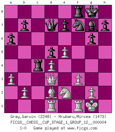 Last move : 1-0 2021 May 14 11:51:42 [Event "FICGS__CHESS__CUP_STAGE_1_GROUP_12__000004"] [Site "FICGS"] [Date "2021.03.02"] [Round "1"] [White "Gray,Garvin"] [Black "Hrubaru,Mircea"] [Result "1-0"] [WhiteElo "2248"] [BlackElo "1473"] 1.e4 c6 2.d4 d5 3.Nc3 g6 4.e5 Bg7 5.Bf4 Nd7 6.Nf3 Nf8 7.Bd3 f6 8.O-O Nh6 9.Re1 Ne6 10.Bg3 O-O 11.Ne2 Ng5 12.Nxg5 fxg5 13.h4 gxh4 14.Bxh4 Bf5 15.Bg5 Bxd3 16.Qxd3 Qd7 17.f3 Nf7 18.Bd2 c5 19.c3 Rac8 20.Rf1 cxd4 21.cxd4 Rc4 22.a3 a6 23.Rad1 1-0 This chess game has been lost on time (started : 2021.03.02 1:15:36) Caro-Kann : Gurgenidze system Kingside Castling by player White (move 8) Kingside Castling by player Black (move 10) Player White won this chess game. Follow this game move after move (download)Chess is like war on a board. (Bobby Fischer) Es gibt nur zwei wahre Schachgenies - das andere war Wilhelm Steinitz, der Weltmeister von 1872 bis 1894. (Robert James Fischer) Hasta este punto, las blancas han seguido un análisis bien conocido. Pero ahora el hace un error fatal: empieza a usar su propia cabeza. (Siegbert Tarrasch) Il n'y a pas eu de défaite parce que je ne crois pas que cet ordinateur ait jamais existé. IBM a triché en refusant d'imprimer les modes de recherche de la machine. C'est évident, pendant le match, des coups décisifs ont été joués par des êtres humains. Aujourd'hui, les meilleurs spécialistes en informatique ne peuvent toujours pas expliquer comment Deep-Blue a pu jouer contre la logique des ordinateurs. IBM a gagné une guerre de communication, mais ils sont incapables de prouver que l'ordinateur a gagné tout seul. (Garry Kasparov) War is the child of passion, passion is the child of narcissism and narcissism is the child. (...) Another game ? (Thibault de Vassal)