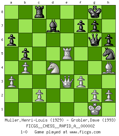 Last move : 1-0 2006 September 22 2:41:8 [Event "FICGS__CHESS__RAPID_A__000002"] [Site "FICGS"] [Date "2006.06.23"] [Round "1"] [White "Muller,Henri-Louis"] [Black "Grobler,Dave"] [Result "1-0"] [WhiteElo "1929"] [BlackElo "1993"] 1.e4 c5 2.Nf3 Nc6 3.d4 cxd4 4.Nxd4 Nf6 5.Nc3 e6 6.Ndb5 Bb4 7.a3 Bxc3+ 8.Nxc3 d5 9.exd5 exd5 10.Bd3 O-O 11.O-O d4 12.Ne2 Qd5 13.Nf4 Qc5 14.Re1 Bg4 15.f3 Bd7 16.Bd2 Rfe8 17.b4 Qb6 18.Rxe8+ Rxe8 19.Be1 Qc7 20.Bg3 Qe5 21.Ne2 Qd5 22.Bf2 a6 23.Qd2 Ne5 24.Nxd4 Nxd3 25.Qxd3 b5 26.Rd1 Qg5 27.Qd2 Qg6 28.Re1 Rc8 29.Re5 h6 30.Bg3 Nh5 31.Bh4 Nf6 32.Qf4 Nh5 33.Qe3 1-0 This chess game has been lost on time (started : 2006.06.23 18:52:33) Sicilian defense Kingside Castling by player Black (move 10) Kingside Castling by player White (move 11) Player White won this chess game. Follow this game move after move (download)One doesn't have to play well, it's enough to play better than your opponent. (Siegbert Tarrasch) Kostenjuk hat keinen Sexappeal. (Loek van Wely) Hasta este punto, las blancas han seguido un análisis bien conocido. Pero ahora el hace un error fatal: empieza a usar su propia cabeza. (Siegbert Tarrasch) Le thème de l'attaque double intervient d'une manière ou d'une autre dans l'immense majorité des combinaisons. (Youri Averbakh) Imagination is more important than knowledge. Knowledge is limited. Imagination encircles the world. (Albert Einstein)