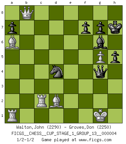Last move : 1/2-1/2 2021 March 27 16:30:16 [Event "FICGS__CHESS__CUP_STAGE_1_GROUP_13__000004"] [Site "FICGS"] [Date "2021.03.02"] [Round "1"] [White "Walton,John"] [Black "Groves,Don"] [Result "1/2-1/2"] [WhiteElo "2290"] [BlackElo "2250"] 1.d4 Nf6 2.c4 e6 3.Nc3 Bb4 4.f3 d5 5.a3 Bxc3+ 6.bxc3 O-O 7.cxd5 exd5 8.e3 Bf5 9.Ne2 c5 10.g4 Bg6 11.Kf2 Nc6 12.h4 h5 13.g5 Nd7 14.Nf4 Ne7 15.a4 Re8 16.a5 Qc7 17.Qb3 Rad8 18.a6 bxa6 19.Bxa6 cxd4 20.cxd4 Nf8 21.Bb5 Rb8 22.Nxd5 Qb7 23.Nxe7+ Rxe7 24.Qa3 Rc8 25.Ra2 Rec7 26.Ba6 Rc2+ 27.Bd2 Qd5 28.Rha1 R8c3 29.Qb4 Rb3 30.e4 Rxf3+ 31.Kxf3 Qxe4+ 32.Kg3 Qg4+ 33.Kf2 Qxh4+ 34.Ke2 Ne6 35.Qb8+ Kh7 36.Rxc2 Nxd4+ 37.Kf1 Qh3+ 38.Kf2 Qf3+ 39.Kg1 Qg4+ 1/2-1/2 Nimzo-Indian : Kmoch variation Kingside Castling by player Black (move 6) This chess game ended in a draw. Follow this game move after move (download)What is the object of playing a gambit opening?... To acquire a reputation of being a dashing player at the cost of losing a game. (Siegbert Tarrasch) Es liegt in der Natur, vernüftig zu denken und unlogisch zu handeln. (Anatole France) El Ajedrez es un invernadero donde los frutos del carácter pueden madurar mas completamente que en la vida. (Edward Morgan Foster) La tactique est l'élément le plus important du milieu de jeu. (Siegbert Tarrasch) Excelling at chess has long been considered a symbol of more general intelligence. That is an incorrect assumption in my view, as pleasant as it might be. But for the purposes of argument and investigation, chess is, in Russkin-Gutman's words, 'an unparalleled laboratory, since both the learning process and the degree of ability obtained can be objectified and quantified, providing an excellent comparative framework on which to use rigorous analytical techniques.' (The Chess Master and the Computer, by Garry Kasparov - 2010)