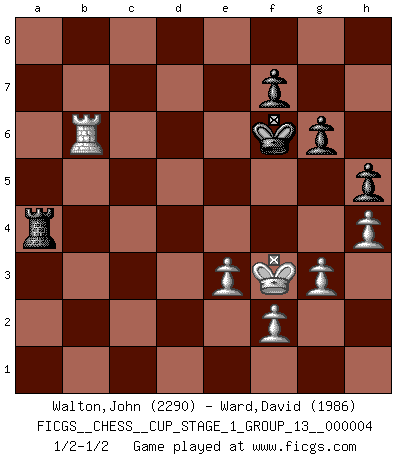 Last move : 1/2-1/2 2021 March 30 4:15:58 [Event "FICGS__CHESS__CUP_STAGE_1_GROUP_13__000004"] [Site "FICGS"] [Date "2021.03.02"] [Round "1"] [White "Walton,John"] [Black "Ward,David"] [Result "1/2-1/2"] [WhiteElo "2290"] [BlackElo "1986"] 1.d4 Nf6 2.c4 e6 3.g3 d5 4.Nf3 dxc4 5.Bg2 Bb4+ 6.Bd2 c5 7.Bxb4 cxb4 8.Ne5 O-O 9.a3 Nd5 10.Nxc4 Qc7 11.Ne5 Nc6 12.Nxc6 bxc6 13.O-O Qb6 14.e3 c5 15.dxc5 Qxc5 16.axb4 Qxb4 17.Nc3 Bb7 18.Nxd5 Bxd5 19.Bxd5 exd5 20.Qxd5 Qxb2 21.Ra6 Rfb8 22.Rfa1 Qb7 23.Qd4 Rc8 24.Rxa7 Rxa7 25.Qxa7 Qxa7 26.Rxa7 g6 27.Kg2 h5 28.Kf3 Rc4 29.Rd7 Kg7 30.h4 Kf6 31.Rb7 Ra4 32.Rb6+ 1/2-1/2 Catalan Opening Kingside Castling by player Black (move 8) Kingside Castling by player White (move 13) This chess game ended in a draw. Follow this game move after move (download)It began to feel as though you were playing against Chess itself. - On playing against Robert Fischer. (Walter Shipman) Wie, soll nun auch die Opposition abgeschafft werden? Ja, es tut mir leid, Ihnen diesen Schmerz nicht ersparen zu können. (Aaron Nimzowitsch) Me siento como si fuera una pieza en una partida de Ajedrez, cuando mi oponente me indica: esa pieza no puede ser movida. (Soren Kierkegaard) Des idées, des idées, j'en ai cent, j'en ai mille. Des bonnes, des mauvaises, applicables, irréalisables... Il suffit de faire le tri ! (Roos) Programming can only do so much before it becomes too much. (Don Groves)