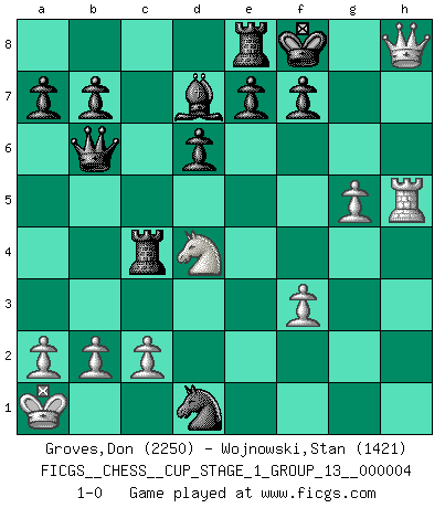 Last move : 1-0 2021 April 7 22:20:19 [Event "FICGS__CHESS__CUP_STAGE_1_GROUP_13__000004"] [Site "FICGS"] [Date "2021.03.02"] [Round "1"] [White "Groves,Don"] [Black "Wojnowski,Stan"] [Result "1-0"] [WhiteElo "2250"] [BlackElo "1421"] 1.e4 c5 2.Nf3 d6 3.Nc3 Nf6 4.d4 cxd4 5.Nxd4 g6 6.Be3 Bg7 7.f3 O-O 8.Qd2 Re8 9.O-O-O Nc6 10.Kb1 Bd7 11.g4 Rc8 12.Be2 Ne5 13.h4 Nc4 14.Bxc4 Rxc4 15.h5 gxh5 16.Bh6 Bxh6 17.Qxh6 Qb6 18.g5 Nxe4 19.Rxh5 Nxc3+ 20.Ka1 Nxd1 21.Qxh7+ Kf8 22.Qh8+ 1-0 Sicilian Kingside Castling by player Black (move 7) Queenside Castling by player White (move 9) Player White won this chess game. Follow this game move after move (download)Half the variations which are calculated in a tournament game turn out to be completely superfluous. Unfortunately, no one knows in advance which half. (Jan Tinman) Über Karpov: Er war und ist ein Vertreter der russischen Reaktionäre. Das steckt tief in seiner Seele, wehalb ich nicht nett mit ihm umgehen kann. (Viktor Kortschnoi) Hoy en día, si tu no eres un Gran Maestro a los 14 años, es mejor que lo olvides. (Anand Viswanathan) Les échecs sont un jeu par leur forme, un art par leur essence et une science par sa difficulté d'acquisition. Ils peuvent vous procurer autant de plaisir qu'un bon livre ou une belle musique, mais vous n'aurez une réelle joie que si vous arrivez à bien jouer. (Tigran Petrosian) Art is not a thing, it is a way. (Elbert Hubbard)