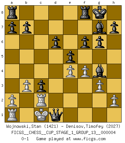 Last move : 0-1 2021 April 13 18:41:15 [Event "FICGS__CHESS__CUP_STAGE_1_GROUP_13__000004"] [Site "FICGS"] [Date "2021.03.02"] [Round "1"] [White "Wojnowski,Stan"] [Black "Denisov,Timofey"] [Result "0-1"] [WhiteElo "1421"] [BlackElo "2027"] 1.e4 c5 2.Nc3 d6 3.g3 Nc6 4.Bg2 g6 5.d3 Bg7 6.Be3 Nf6 7.Qd2 Ng4 8.Bf4 e5 9.Bg5 f6 10.Be3 O-O 11.f4 Nd4 12.Nf3 Nxe3 13.Qxe3 Nxc2+ 14.Kd2 Nxe3 15.Kxe3 Qb6 16.b3 c4 17.Kd2 Qf2+ 18.Kd1 Qxg2 19.Re1 Qxf3+ 20.Kd2 Qxd3+ 21.Kc1 Qxc3+ 22.Kd1 Bg4+ 23.Re2 Qd3+ 24.Kc1 c3 25.Rc2 Qd1+ 0-1 Sicilian : Closed Kingside Castling by player Black (move 10) Player Black won this chess game. Follow this game move after move (download)Up to this point White has been following well-known analysis. But now he makes a fatal error: he begins to use his own head. (Siegbert Tarrasch) Das Schachspiel hat wie die Liebe, die Musik, die Fähigkeit, den Menschen glücklich zu machen. Ich habe ein leises Gefühl des Bedauerns für jeden, der das Schachspiel nicht kennt, so wie ich jeden bedaure, der die Liebe nicht kennt. (Siegbert Tarrasch) Coloca el contenido del tablero de Ajedrez en un sombrero, agita las piezas vigorosamente, derrámalas en el tablero desde una altura de medio metro y así obtienes el estilo de Wilhelm Steinitz. (H. E. Bird) Toutes choses étant égales, c'est la conviction qui gagne. Alliée à une volonté de vaincre, elle sert de détonateur, suscite des idées, disperse les doutes et aide à penser clairement. (Robert Fischer) This is where the fun begins. (Anakin Skywalker in Star Wars ep.3)