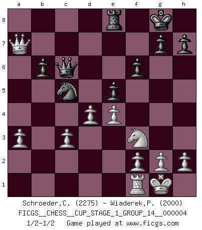 Last move : 1/2-1/2 2021 March 21 17:46:19 [Event "FICGS__CHESS__CUP_STAGE_1_GROUP_14__000004"] [Site "FICGS"] [Date "2021.03.02"] [Round "1"] [White "Schroeder,Christoph"] [Black "Wiaderek,Piotr"] [Result "1/2-1/2"] [WhiteElo "2275"] [BlackElo "2000"] 1.e4 e5 2.Nf3 Nc6 3.Bb5 Nf6 4.d3 Bc5 5.Bxc6 dxc6 6.Nbd2 Nd7 7.Nc4 f6 8.c3 Nb6 9.Na5 O-O 10.b4 Bd6 11.O-O Qe8 12.a3 c5 13.Be3 Na4 14.Nxb7 Bxb7 15.bxc5 Bxc5 16.Qb3+ Rf7 17.Qxb7 Rb8 18.Qa6 Rb6 19.Qxa7 Qc6 20.Bxc5 Nxc5 21.d4 Rf8 22.Rab1 Ra8 23.Rxb6 cxb6 24.Qe7 Re8 25.Qa7 1/2-1/2 Ruy Lopez : Berlin defense Kingside Castling by player Black (move 9) Kingside Castling by player White (move 11) This chess game ended in a draw. Follow this game move after move (download)Chess is everything: art, science and sport. (Anatoly Karpov) Ich spiele ehrlich und spiele, um zu gewinnen. Wenn ich verliere nehme ich meine Medizin. (Robert James Fischer) Bobby es la celebridad menos entendida y malinterpretada que camina el la faz de esta tierra. (Yasser Seirawan) La menace est plus forte que l'exécution. (Aaron Nimzovitch) Man is still the most extraordinary computer of all. (John F. Kennedy)