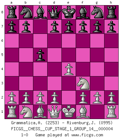 Last move : 1-0 2021 April 2 16:15:13 [Event "FICGS__CHESS__CUP_STAGE_1_GROUP_14__000004"] [Site "FICGS"] [Date "2021.03.02"] [Round "1"] [White "Grammatica,Andrea"] [Black "Rivenburg,John"] [Result "1-0"] [WhiteElo "2253"] [BlackElo "0995"] 1.e4 c5 2.Nf3 1-0 This chess game has been lost on time (started : 2021.03.02 1:15:39) Sicilian defense Player White won this chess game. Follow this game move after move (download)Dazzling combinations are for the many, shifting wood is for the few. (Georg Kieninger) Im Blitz ist es einfacher mit einer Figur weniger anzugreifen, als sich mit einer Mehrfigur zu verteidigen. (Mikhail Nekhemyevich Tal) Si pudieramos observar el interior de la cabeza de un jugador de Ajedrez, encontraríamos ahí un mundo lleno de sentimientos, imágenes, ideas, emoción y pasión. (Alfred Binet) Il n'y a pas eu de défaite parce que je ne crois pas que cet ordinateur ait jamais existé. IBM a triché en refusant d'imprimer les modes de recherche de la machine. C'est évident, pendant le match, des coups décisifs ont été joués par des êtres humains. Aujourd'hui, les meilleurs spécialistes en informatique ne peuvent toujours pas expliquer comment Deep-Blue a pu jouer contre la logique des ordinateurs. IBM a gagné une guerre de communication, mais ils sont incapables de prouver que l'ordinateur a gagné tout seul. (Garry Kasparov) It is the aim of the modern school, not to treat every position according to one general law, but according to the principle inherent in the position. (Richard Reti)