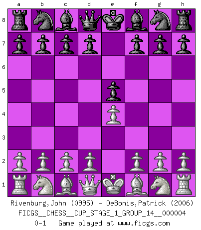Last move : 0-1 2021 April 2 4:5:27 [Event "FICGS__CHESS__CUP_STAGE_1_GROUP_14__000004"] [Site "FICGS"] [Date "2021.03.02"] [Round "1"] [White "Rivenburg,John"] [Black "DeBonis,Patrick"] [Result "0-1"] [WhiteElo "0995"] [BlackElo "2006"] 1.e4 e5 0-1 This chess game has been lost on time (started : 2021.03.02 1:15:39) King's pawn game Player Black won this chess game. Follow this game move after move (download)Chess mastery essentially consists of analyzing Chess positions accurately. (Mikhail Botvinnik) Meine Liebe ist Schach, Schach, Schach. Ich muss jeden Tag Schach spielen, deshalb fühle ich mich so stark. (Miguel Najdorf) En la perfecta combinación de Ajedrez como en una historia corta de primera clase, toda la trama y contra trama deberá conducir hacia un final sorprendente, el interes no es mitigado hasta el último momento. (Yates and Winter) Les échecs sont utiles à l'exercice de la faculté de penser et à celle de l'imagination. Car nous devons posséder une méthode élaborée pour atteindre des buts partout où nous devons conduire notre raison. (Leibnitz) A specialist learns more and more about less and less until he knows everything about nothing. (Nicholas Murray Butler)