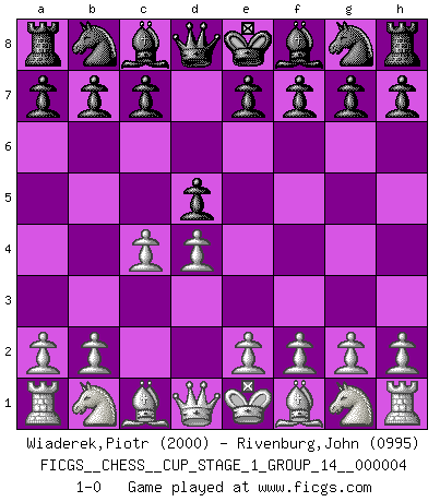 Last move : 1-0 2021 April 2 16:15:13 [Event "FICGS__CHESS__CUP_STAGE_1_GROUP_14__000004"] [Site "FICGS"] [Date "2021.03.02"] [Round "1"] [White "Wiaderek,Piotr"] [Black "Rivenburg,John"] [Result "1-0"] [WhiteElo "2000"] [BlackElo "0995"] 1.d4 d5 2.c4 1-0 This chess game has been lost on time (started : 2021.03.02 1:15:39) Queen's Gambit Player White won this chess game. Follow this game move after move (download)Chess is imagination. (David Bronstein) Sicherlich können nur Meister einen Stil haben. Daß ein nicht-Meister auch nur ein einziges Mal in seinem Leben eine Partie folgerecht durchführte, habe ich niemals bemerkt. (Emanuel Lasker) Personalmente, yo prefiero mirar hacia el futuro en donde un programa de computadora gane el título mundial de Ajedrez. La humanidad necesita una lección de humildad. (Richard Dawkings) Une platitude souvent récitée à propos des Echecs est qu'une des choses les plus difficiles à réaliser est de gagner une position gagnante. Cela ne manque pas de sens mais, pour ma part, j'ai toujours trouvé plus difficile de gagner une position perdante. (Tim Krabbe) Luck never made a man wise. (Seneca, Letters to Lucilius)