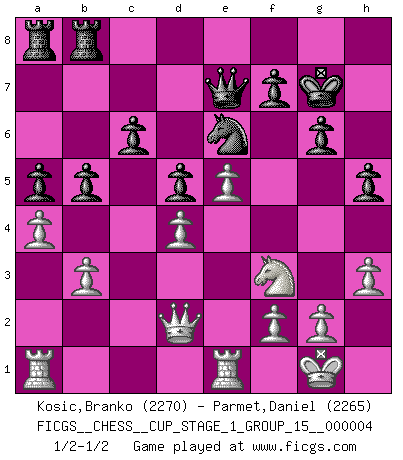 Last move : 1/2-1/2 2021 April 21 18:57:6 [Event "FICGS__CHESS__CUP_STAGE_1_GROUP_15__000004"] [Site "FICGS"] [Date "2021.03.02"] [Round "1"] [White "Kosic,Branko"] [Black "Parmet,Daniel"] [Result "1/2-1/2"] [WhiteElo "2270"] [BlackElo "2265"] 1.e4 e5 2.Nf3 Nc6 3.Bc4 Nf6 4.d3 Bc5 5.c3 d6 6.Bb3 a5 7.a4 h6 8.O-O O-O 9.Nbd2 Re8 10.Re1 Be6 11.Nc4 Qd7 12.Be3 Bxe3 13.Nxe3 Bxb3 14.Qxb3 Nd8 15.Nf5 g6 16.Ng3 c6 17.Rad1 Qc7 18.Qc2 Ne6 19.d4 Kg7 20.Nf1 h5 21.h3 exd4 22.cxd4 d5 23.e5 Ne4 24.N1d2 Nxd2 25.Qxd2 Qe7 26.b3 b5 27.Ra1 Reb8 1/2-1/2 Two knights defense (Modern Bishop's Opening) Kingside Castling by player White (move 8) Kingside Castling by player Black (move 8) This chess game ended in a draw. Follow this game move after move (download)Everything is in a state of flux, and this includes the world of Chess. (Mikhail Botvinnik) Ich spiele 70 Eröffnungssysteme. (Viktor Kortschnoi) El Ajedrez lo es todo: arte, ciencia y deporte. (Anatoly Karpov) Tout change constamment, y compris dans le monde des Echecs. (Botvinnik) Only sick music makes money today. (Friedrich Nietzsche)