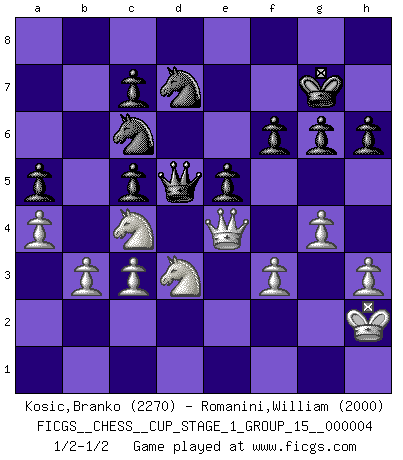 Last move : 1/2-1/2 2021 May 1 8:12:39 [Event "FICGS__CHESS__CUP_STAGE_1_GROUP_15__000004"] [Site "FICGS"] [Date "2021.03.02"] [Round "1"] [White "Kosic,Branko"] [Black "Romanini,William"] [Result "1/2-1/2"] [WhiteElo "2270"] [BlackElo "2000"] 1.e4 e5 2.Nf3 Nc6 3.Bc4 Bc5 4.c3 Nf6 5.d3 a6 6.Bb3 d5 7.Qe2 dxe4 8.dxe4 Qe7 9.O-O O-O 10.a4 a5 11.Re1 h6 12.Nbd2 Ng4 13.Rf1 Nf6 14.Kh1 Rd8 15.h3 Be6 16.Bc2 b6 17.Nb3 Bd6 18.Be3 Bc8 19.Rfd1 Ba6 20.Bd3 Bxd3 21.Qxd3 Qe6 22.Qc2 Bf8 23.Nbd2 Rd7 24.b3 Rad8 25.Ne1 Bc5 26.Bxc5 bxc5 27.Nc4 Rxd1 28.Rxd1 Rxd1 29.Qxd1 Nxe4 30.Qf3 Nf6 31.Qe3 Qd5 32.Nd3 Nd7 33.Nd2 Ne7 34.Nc4 Nc6 35.Kh2 g6 36.f3 Kg7 37.g4 f6 38.Qe4 1/2-1/2 Giuoco Piano Kingside Castling by player White (move 9) Kingside Castling by player Black (move 9) This chess game ended in a draw. Follow this game move after move (download)I like to say that Bobby Fischer was the greatest player ever. But what made Fischer a genius was his ability to blend an American freshness and pragmatism with Russian ideas about strategy. (Bruce Pandolfini) Kann Schach nicht schließlich das Nationalspiel der Deutschen werden? Und welche weiteren Ausblicke bieten sich dann dar! Welche Hebung des allgemeinen Kultur-Niveaus, ja der Moral, wenn das Schachbrett den Kartentisch verdrängen würde! Wahrlich, ein Ziel, des Schweißes der Edlen wert! (Siegbert Tarrasch) Aquellos que dicen que entienden al Ajedrez, no entienden nada. (Robert Hubner) Des idées, des idées, j'en ai cent, j'en ai mille. Des bonnes, des mauvaises, applicables, irréalisables... Il suffit de faire le tri ! (Roos) Plans are ideas that never come to fruition. (Daniel Parmet)