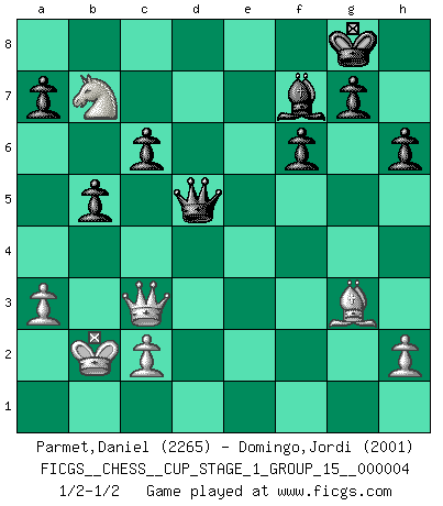 Last move : 1/2-1/2 2021 May 5 22:15:26 [Event "FICGS__CHESS__CUP_STAGE_1_GROUP_15__000004"] [Site "FICGS"] [Date "2021.03.02"] [Round "1"] [White "Parmet,Daniel"] [Black "Domingo,Jordi"] [Result "1/2-1/2"] [WhiteElo "2265"] [BlackElo "2001"] 1.e4 e5 2.Nf3 d6 3.d4 exd4 4.Nxd4 Nf6 5.Nc3 Be7 6.Bf4 O-O 7.Qd2 d5 8.Ndb5 Bb4 9.O-O-O c6 10.Nc7 Nxe4 11.Qd4 Bxc3 12.bxc3 Qe7 13.c4 Qa3+ 14.Qb2 Qa5 15.Nxa8 Nxf2 16.Be2 Na6 17.cxd5 Nxh1 18.Rxh1 Nb4 19.Bc4 Qc5 20.Bd2 Nxd5 21.Bxd5 Qxd5 22.Bf4 Rd8 23.Nc7 Qxg2 24.Re1 Bf5 25.Qc3 h6 26.Kb2 b5 27.Re8+ Rxe8 28.Nxe8 f6 29.Nd6 Be6 30.a3 Qd5 31.Nb7 Bf7 32.Bg3 Qa2+ 33.Kc1 Qd5 34.Kb2 Qa2+ 35.Kc1 Qd5 36.Kb2 1/2-1/2 Philidor : Exchange variation Kingside Castling by player Black (move 6) Queenside Castling by player White (move 9) This chess game ended in a draw. Follow this game move after move (download)When I have White, I win because I am white; When I have Black, I win because I am Bogolyubov. (Bogolyubov) Schach sollte überall auf der Welt Schulfach werden. Es fördert die geistige Auseinandersetzung. Es lehrt die Demut in der Niederlage. (Garry Kasparov) Cuando estes solo, cuando te sientas un extraño en el mundo, juega al Ajedrez. Esto levantará tu espiritu y será tu consejero de guerra. (Aristóteles) Un journaliste : 'Vous préférez avoir une dame de plus sur l'échiquier ou au lit ?' Boris Spassky : 'Ca dépend de la position.' CHESS, n. f. [echecs, Fr.] A nice and abstruse game, in which two sets of puppets are moved in opposition to each other. (Dr Samuel Johnson, A Dictionary Of The English Language, 1755)