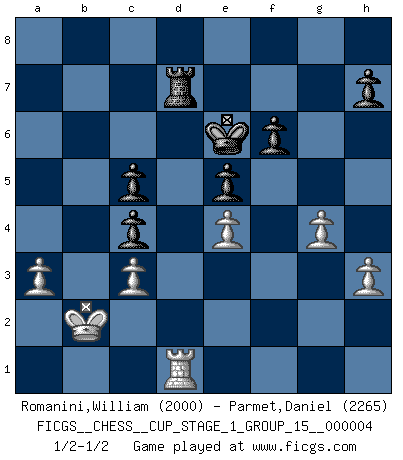 Last move : 1/2-1/2 2021 March 14 18:56:50 [Event "FICGS__CHESS__CUP_STAGE_1_GROUP_15__000004"] [Site "FICGS"] [Date "2021.03.02"] [Round "1"] [White "Romanini,William"] [Black "Parmet,Daniel"] [Result "1/2-1/2"] [WhiteElo "2000"] [BlackElo "2265"] 1.e4 c5 2.Nc3 d6 3.Nge2 Nf6 4.d4 cxd4 5.Nxd4 a6 6.h3 e5 7.Nb3 Be6 8.Be3 Nc6 9.Qf3 Rc8 10.O-O-O Na5 11.Bg5 Be7 12.Bxf6 Bxf6 13.Kb1 b5 14.Nd5 Nc4 15.Bxc4 bxc4 16.Nc1 Bxd5 17.Rxd5 Qb6 18.Qe3 Qxe3 19.fxe3 Ke7 20.Rhd1 Rc6 21.a3 Bg5 22.Na2 Ke6 23.Nb4 Rb6 24.Ra5 Rhb8 25.g4 Bxe3 26.Ka1 R6b7 27.Rxa6 Bc5 28.c3 f6 29.Rc6 Rb6 30.Rc7 R8b7 31.Rc8 Rb8 32.Rc7 R8b7 33.Na6 Rxb2 34.Rxg7 Rxg7 35.Nxc5+ dxc5 36.Kxb2 Rd7 1/2-1/2 Sicilian : Closed Queenside Castling by player White (move 10) This chess game ended in a draw. Follow this game move after move (download)A big shock; the best chess player in history has passed away. (Lajos Portisch, about Bobby Fischer's death) Karpov ist ein Museumsstück. (Garry Kasparov) Las piezas de Ajedrez son los bloques del alfabeto que moldean los pensamientos; y esos pensamientos, aunque hagan un diseño visual en el tablero, expresan abstractamente su belleza como un poema. (Marcel Duchamp) J'ai toujours senti une vague pitié pour l'homme qui ne connaît rien aux échecs, tout comme j'en aurais pour un homme ignorant de l'amour. Les Echecs, comme la musique ou comme l'amour, ont le pouvoir de rendre heureux. (Siegbert Tarrasch) Life is verb, not a noun. (Charlotte Perkins Gilman)