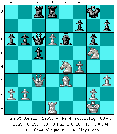 Last move : 1-0 2021 March 20 10:32:39 [Event "FICGS__CHESS__CUP_STAGE_1_GROUP_15__000004"] [Site "FICGS"] [Date "2021.03.02"] [Round "1"] [White "Parmet,Daniel"] [Black "Humphries,Billy"] [Result "1-0"] [WhiteElo "2265"] [BlackElo "0974"] 1.d4 Nf6 2.c4 d5 3.cxd5 Nxd5 4.e4 Nb6 5.Nc3 g6 6.Be3 Bg7 7.h3 Nc6 8.d5 Ne5 9.f4 Nec4 10.Bxc4 Nxc4 11.Qa4+ Bd7 12.Qxc4 O-O 13.Nf3 a6 14.O-O c6 15.Rfd1 Rc8 16.d6 Be6 17.Qc5 b6 18.Qa3 c5 19.e5 exd6 20.Rxd6 Qc7 21.Rad1 Rfd8 22.Ng5 Bf8 23.Nce4 Bxd6 24.exd6 Qc6 25.Qc3 1-0 Queen's pawn game Kingside Castling by player Black (move 12) Kingside Castling by player White (move 14) Player White won this chess game. Follow this game move after move (download)Chess is thirty to forty percent psychology. You don't have this when you play a computer. I can't confuse it. (Judith Polgar) Es gibt nur zwei wahre Schachgenies - das andere war Wilhelm Steinitz, der Weltmeister von 1872 bis 1894. (Robert James Fischer) Fischer era un maestro de claridad y un Rey del posicionamiento astuto. Sus oponentes podían ver hacia donde se dirigía pero eran impotentes para detenerlo. (Bruce Pandolfini) Pour moi, les échecs ne sont pas un jeu mais un art. (Alexandre Alekhine) When you have everything, sometimes it feels like nothing. (Horatio Caine, C.S.I. Miami)