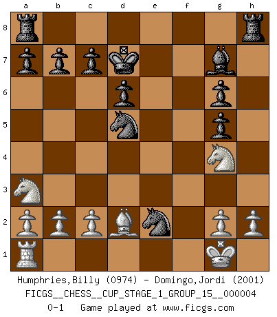 Last move : 0-1 2021 April 1 18:48:33 [Event "FICGS__CHESS__CUP_STAGE_1_GROUP_15__000004"] [Site "FICGS"] [Date "2021.03.02"] [Round "1"] [White "Humphries,Billy"] [Black "Domingo,Jordi"] [Result "0-1"] [WhiteElo "0974"] [BlackElo "2001"] 1.e4 e5 2.Nf3 f5 3.Nxe5 Qf6 4.d4 d6 5.Nc4 fxe4 6.Nc3 Qg6 7.f3 exf3 8.Qxf3 Nc6 9.Bd3 Qg4 10.O-O Qxf3 11.Rxf3 Nxd4 12.Re3+ Ne7 13.Nd5 Kd8 14.Nf4 g5 15.Nh5 Bf5 16.Na3 Bg6 17.Bxg6 hxg6 18.Nf6 Bg7 19.Ng4 Kd7 20.Bd2 Nd5 21.Re2 Nxe2+ 0-1 Latvian counter-gambit Kingside Castling by player White (move 10) Player Black won this chess game. Follow this game move after move (download)You may learn much more from a game you lose than from a game you win. You will have to lose hundreds of games before becoming a good player. (Jose Raul Capablanca) Verschiedene, sehr schätzbare und im Laufe des Lebens nützliche Eigenschaften des Geistes können durch das Schachspiel erworben und gekräftigt werden, so dass sie zu Gewohnheiten werden, die uns nie im Stich lassen. (Benjamin Franklin) Vive, pierde y aprende al observar a tu oponente como ganar. (Amber Steenbock) On n'a jamais que l'âge auquel on a commence à jouer aux échecs car après on cesse de vieillir. (Capablanca) Real knowledge is to know the extent of one's ignorance. (Confucius)
