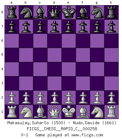 Last move : 0-1 2021 April 1 16:0:27 [Event "FICGS__CHESS__RAPID_C__000258"] [Site "FICGS"] [Date "2021.03.02"] [Round "1"] [White "Makasulay,Suharto"] [Black "Nudo,Davide"] [Result "0-1"] [WhiteElo "1500"] [BlackElo "1661"] 0-1 This chess game has been lost on time (started : 2021.03.02 8:13:42) Player Black won this chess game. Follow this game move after move (download)Bobby just drops the pieces and they fall on the right squares. (Miguel Najdorf) Ivan Sokolov treibt mich als Beifahrer an mit go Loeky go - . (Loek van Wely) Las leyes del Ajedrez no permiten una libre elección: tienes que mover quieras o no. (Emanuel Lasker) Plusieurs personnes se sont demandées comment Tal faisait pour gagner... En fait, c'est très simple ! Il met ses pièces au centre de l'échiquier et les sacrifie quelque part ! (David Bronstein) Memory... is the diary that we all carry with us. (Oscar Wilde, The Importance of Being Earnest)
