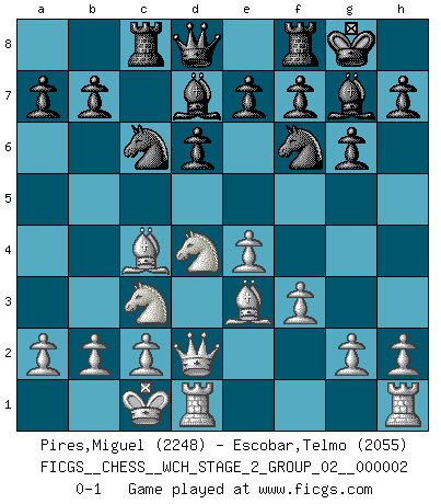 Last move : 0-1 2007 September 9 13:35:13 [Event "FICGS__CHESS__WCH_STAGE_2_GROUP_02__000002"] [Site "FICGS"] [Date "2007.07.11"] [Round "1"] [White "Pires,Miguel"] [Black "Escobar,Telmo"] [Result "0-1"] [WhiteElo "2248"] [BlackElo "2055"] 1.e4 c5 2.Nf3 d6 3.d4 cxd4 4.Nxd4 Nf6 5.Nc3 g6 6.f3 Bg7 7.Bc4 Nc6 8.Be3 O-O 9.Qd2 Bd7 10.O-O-O Rc8 0-1 This chess game has been lost on time (started : 2007.07.11 18:37:4) Sicilian : Dragon variation Kingside Castling by player Black (move 8) Queenside Castling by player White (move 10) Player Black won this chess game. Follow this game move after move (download)If cunning alone were needed to excel, women would be the best Chess players. (Albin) Du kannst im Schach nur gut werden, wenn du das Spiel liebst. (Robert James Fischer) El juego del Ajedrez no es solamente una diversión quieta; algunas cualidades muy valuables de la mente se pueden adquirir y cultivar con el, como convertirlos en habitos disponibles para toda ocasión; ya que la vida es algo así como el Ajedrez. (Benjamin Franklin) Assurément je connaissais par expérience le mystérieux attrait de ce jeu royal, le seul entre tous les jeux inventés par les hommes qui échappe souverainement à la tyrannie du hasard, le seul où l'on ne doive sa victoire qu'à son intelligence ou plutôt à une certaine forme d'intelligence. Mais n'est-ce pas déjà le limiter injurieusement que d'appeler les échecs un jeu ? N'est-ce pas une science, un art ou quelque chose qui, comme le cercueil de Mahomet entre ciel et terre, est suspendu entre l'un et l'autre, et qui réunit un nombre incroyable de contraires ? [...] C'est une pensée qui ne mène à rien, une mathématique qui n'établit rien, un art qui ne laisse pas d'uvre, une architecture sans matière; et il l'a prouvé néanmoins qu'il était plus durable, à sa manière, que les livres ou que tout autre monument, ce jeu unique qui appartient à tous les peuples et à tous les temps, et dont personne ne sait quel dieu en fit don à la terre pour tuer l'ennui, pour aiguiser l'esprit et stimuler l'âme. Où commence-t-il, où finit-il ? (Stefan Zweig) That's absurd. I love it. (Gregory House, House M.D.)