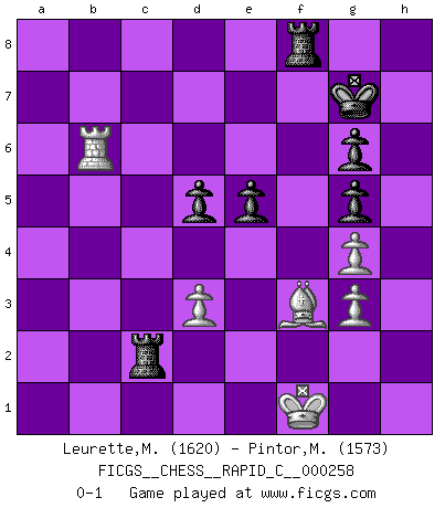 Last move : 0-1 2021 March 22 21:31:32 [Event "FICGS__CHESS__RAPID_C__000258"] [Site "FICGS"] [Date "2021.03.02"] [Round "1"] [White "Leurette,Marc-Antoine"] [Black "Pintor,Manuel"] [Result "0-1"] [WhiteElo "1620"] [BlackElo "1573"] 1.e4 e5 2.Nf3 Nc6 3.Bc4 Bc5 4.c3 Qf6 5.d3 h6 6.b4 Bb6 7.a4 a6 8.O-O d6 9.b5 axb5 10.Bxb5 Nge7 11.Nbd2 O-O 12.Bb2 Qg6 13.Kh1 f5 14.Nh4 Qg5 15.Ndf3 Qg4 16.h3 Qh5 17.Bc4+ Kh7 18.exf5 Nxf5 19.Nxf5 Bxf5 20.Ng1 Qg6 21.Nf3 Qh5 22.Bd5 Rab8 23.c4 Bg4 24.Be4+ g6 25.Ng5+ hxg5 26.Qxg4 Qxg4 27.hxg4 Bxf2 28.Bf3 Bc5 29.g3 Kg7 30.Bc3 Nd4 31.Bxd4 Bxd4 32.Ra2 c6 33.Kg2 Rbd8 34.a5 d5 35.cxd5 cxd5 36.Rb1 Rf7 37.a6 bxa6 38.Rxa6 Rc7 39.R1b6 Bxb6 40.Rxb6 Rc2+ 41.Kf1 Rf8 0-1 Giuoco Piano Kingside Castling by player White (move 8) Kingside Castling by player Black (move 11) Player Black won this chess game. Follow this game move after move (download)Place the contents of the Chess box in a hat, shake them up vigorously, pour them on the board from a height of two feet, and you get the style of Steinitz. (H. E. Bird) Wer der Ansicht ist, daß alle Schachspieler verrückt sind, wird durch Studium des Lebens von Emil Josef Diemer nicht auf andere Gedanken kommen. (Hans Ree) Un buen sacrificio es aquel que aunque no sea necesariamente sólido, deja a tu oponente aturdido y confuso. (Rudolph Spielmann) J'ai toujours senti une vague pitié pour l'homme qui ne connaît rien aux échecs, tout comme j'en aurais pour un homme ignorant de l'amour. Les Echecs, comme la musique ou comme l'amour, ont le pouvoir de rendre heureux. (Siegbert Tarrasch) Chess is everything: art, science and sport. (Anatoly Karpov)