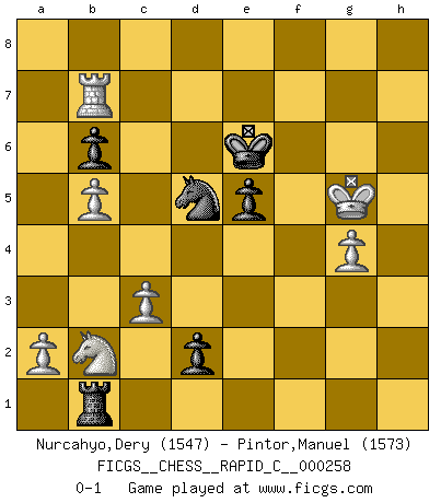 Last move : 0-1 2021 April 16 6:53:20 [Event "FICGS__CHESS__RAPID_C__000258"] [Site "FICGS"] [Date "2021.03.02"] [Round "1"] [White "Nurcahyo,Dery"] [Black "Pintor,Manuel"] [Result "0-1"] [WhiteElo "1547"] [BlackElo "1573"] 1.c3 e5 2.e4 Nc6 3.Bc4 Bc5 4.b4 Bb6 5.Nf3 Qf6 6.O-O d6 7.d3 h6 8.Be3 Bg4 9.Nbd2 Qg6 10.Qb3 Nf6 11.h3 Bxh3 12.Nh4 Qg4 13.Bxf7+ Kd8 14.Bxb6 axb6 15.Ndf3 g5 16.Kh2 gxh4 17.Rg1 Nh5 18.Bxh5 Qxh5 19.Kxh3 Kd7 20.Nxh4 Raf8 21.g4 Rf3+ 22.Rg3 Rxg3+ 23.fxg3 Qg5 24.Rf1 h5 25.Qf7+ Ne7 26.gxh5 Qxh5 27.Qxh5 Rxh5 28.Rf7 Ke6 29.Rg7 c5 30.b5 d5 31.Kg4 Rh6 32.Kg5 Rf6 33.g4 c4 34.exd5+ Nxd5 35.Rxb7 cxd3 36.Ng2 Rf2 37.Ne3 d2 38.Nd1 Rf1 39.Nb2 Rb1 0-1 Saragossa Opening Kingside Castling by player White (move 6) Player Black won this chess game. Follow this game move after move (download)Chess is a sea in which a gnat may drink and an elephant may bathe. (Hindu proverb) Sicherlich können nur Meister einen Stil haben. Daß ein nicht-Meister auch nur ein einziges Mal in seinem Leben eine Partie folgerecht durchführte, habe ich niemals bemerkt. (Emanuel Lasker) Bobby Fischer es el mas grande genio de Ajedrez de todos los tiempos. (Alexander Kotov) Il (Jacob Murray) ne joue pas pour le bon coup, mais pour le meilleur. (Eloi Relange) No enterprise is more likely to succeed than one concealed from the enemy until it is ripe for execution. (Niccolo Machiavelli)