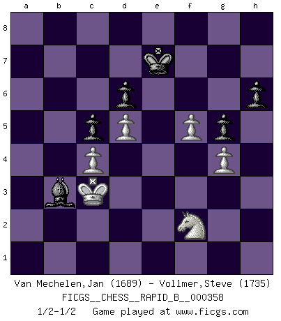 Last move : 1/2-1/2 2021 May 31 12:44:36 [Event "FICGS__CHESS__RAPID_B__000358"] [Site "FICGS"] [Date "2021.03.09"] [Round "1"] [White "Van Mechelen,Jan"] [Black "Vollmer,Steve"] [Result "1/2-1/2"] [WhiteElo "1689"] [BlackElo "1735"] 1.d4 Nf6 2.c4 d6 3.Nf3 b6 4.g3 Bb7 5.Bg2 e6 6.O-O Be7 7.Nc3 O-O 8.Qc2 Nbd7 9.e4 c5 10.d5 a6 11.a4 Qc7 12.b3 exd5 13.exd5 Rfe8 14.Bb2 Rad8 15.Nh4 Ne5 16.Nf5 Bf8 17.Rae1 g6 18.Ne3 Bg7 19.h3 Bc8 20.f4 Ned7 21.Ncd1 Re7 22.Nf2 Rde8 23.Qd2 Nh5 24.Kh2 f5 25.Bxg7 Kxg7 26.Nc2 Ndf6 27.Rxe7+ Rxe7 28.Re1 Kf7 29.Rxe7+ Qxe7 30.Qe3 Qxe3 31.Nxe3 h6 32.Bf3 Bd7 33.Be2 Ng7 34.Kg2 Nge8 35.Kf3 Nc7 36.g4 fxg4+ 37.hxg4 g5 38.f5 Ke7 39.Ne4 b5 40.axb5 axb5 41.Nxf6 Kxf6 42.Ke4 bxc4 43.bxc4 Ba4 44.Bd3 Na6 45.Nf1 Nb4 46.Ng3 Nxd3 47.Kxd3 Bd1 48.Ne4+ Ke7 49.Nf2 Bb3 50.Kc3 1/2-1/2 Old Indian defense Kingside Castling by player White (move 6) Kingside Castling by player Black (move 7) This chess game ended in a draw. Follow this game move after move (download)There are two types of sacrifices: correct ones and mine. (Mikhail Tal) Schach verlangt totale Konzentration. (Robert James Fischer) No es suficiente ser un buen jugador, se debe también de jugar bién. (Siegbert Tarrasch) Je menace de comprendre la position. (Anonyme) I can't decide which is riskier; taking crazy risks, or taking advice on crazy risks from a crazy risk taker. (Gregory House in House M.D.)