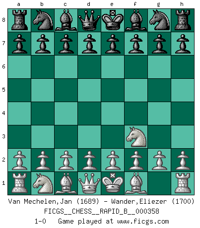 Last move : 1-0 2021 April 9 22:50:6 [Event "FICGS__CHESS__RAPID_B__000358"] [Site "FICGS"] [Date "2021.03.09"] [Round "1"] [White "Van Mechelen,Jan"] [Black "Wander,Eliezer"] [Result "1-0"] [WhiteElo "1689"] [BlackElo "1700"] 1.Nf3 1-0 This chess game has been lost on time (started : 2021.03.09 20:5:38) Reti Opening Player White won this chess game. Follow this game move after move (download)The most powerful weapon in Chess is to have the next move. (David Bronstein) Ich organisiere ein großes Turnier, was mich etwa 120000 Dollar kostet. Ich denke, das ist das erste Mal in der Schachgeschichte, daß ein Schachgroßmeister auch als Mäzen auftritt. (Miguel Najdorf) Una compensación adecuada por un sacrificio es tener una combinación sólida que conduce a una posición ganadora; una compensación adecuada por una metida de pata es dejar a tu oponente arrebatar una derrota de las fauces de la victoria. (Bruce A. Moon) Même si vous avez un bon coup à faire, regardez toujours s'il n'y en a pas un qui lui soit préférable. (Pedro Damiano) My poor ole parrot... Is not in the circulation of displays ....poo hoo hoo :) (Wayne Lowrance's enigma)