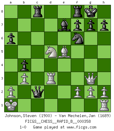 Last move : 1-0 2021 April 4 13:2:48 [Event "FICGS__CHESS__RAPID_B__000358"] [Site "FICGS"] [Date "2021.03.09"] [Round "1"] [White "Johnson,Steven"] [Black "Van Mechelen,Jan"] [Result "1-0"] [WhiteElo "1900"] [BlackElo "1689"] 1.d4 Nf6 2.Nc3 d5 3.Bf4 a6 4.Qd3 e6 5.e4 dxe4 6.Nxe4 Nbd7 7.Nxf6+ Nxf6 8.Be5 Be7 9.Qg3 O-O 10.O-O-O Bd7 11.Bxc7 Qc8 12.Be5 Bb5 13.Be2 Bxe2 14.Nxe2 Qc4 15.Nc3 Rac8 16.Rd3 b5 17.Kb1 b4 18.b3 Qc6 19.d5 exd5 20.Nxd5 Qxc2+ 21.Ka1 1-0 Queen's pawn game Kingside Castling by player Black (move 9) Queenside Castling by player White (move 10) Player White won this chess game. Follow this game move after move (download)Chess is a terrific way for kids to build self image and self esteem. (Saudin Robovic) Spielt Blackmar-Diemer-Gambit, und das Matt kommt von selbst! (Emil Joseph Diemer) El jugador blanco perdió porque fallo en recordar la coreccta continuación y tuvo que pensar por sí mismo las movidas. (Siegbert Tarrasch) Il n'y a pas eu de défaite parce que je ne crois pas que cet ordinateur ait jamais existé. IBM a triché en refusant d'imprimer les modes de recherche de la machine. C'est évident, pendant le match, des coups décisifs ont été joués par des êtres humains. Aujourd'hui, les meilleurs spécialistes en informatique ne peuvent toujours pas expliquer comment Deep-Blue a pu jouer contre la logique des ordinateurs. IBM a gagné une guerre de communication, mais ils sont incapables de prouver que l'ordinateur a gagné tout seul. (Garry Kasparov) I couldn't make any sense out of what this particular thread is about. It sounds like R2 D2 computer speaking. A space fight ?!? Some 'command' problems in Moscow ? Some killers & narcotic addicts attacking some game & a god wannabe ?? (Dinesh De Silva, lost in a russian conflict in FICGS forum)