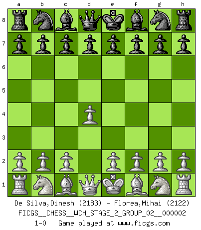 Last move : 1-0 2007 August 22 17:3:47 [Event "FICGS__CHESS__WCH_STAGE_2_GROUP_02__000002"] [Site "FICGS"] [Date "2007.07.11"] [Round "1"] [White "De Silva,Dinesh"] [Black "Florea,Mihai"] [Result "1-0"] [WhiteElo "2183"] [BlackElo "2122"] 1.d4 1-0 This chess game has been lost on time (started : 2007.07.11 18:37:4) Queen's pawn Player White won this chess game. Follow this game move after move (download)The winner of the game is the player who makes the next-to-last mistake. (Savielly Tartakover) In der Schule lernt man nichts. Es ist nur Zeitverschwendung. (Robert James Fischer) El Ajedrez es la vida. (Bobby Fischer) Les Cavaliers se révèlent fort utiles dans les positions fermées. D'habitude, les Fous sont un peu plus forts que les Cavaliers dans les positions ouvertes. Qu'on le veuille ou non, il restera toujours des exceptions ! Luck has a peculiar habit of favoring those who don't depend on it. (Author unknown)