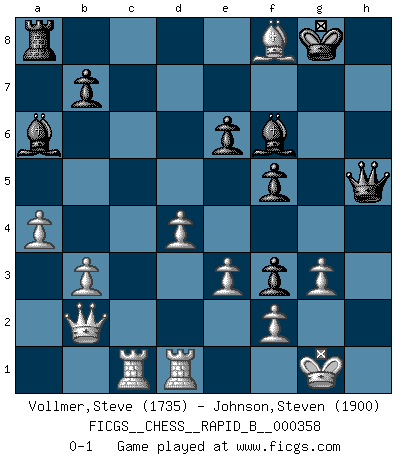 Last move : 0-1 2021 May 19 21:15:37 [Event "FICGS__CHESS__RAPID_B__000358"] [Site "FICGS"] [Date "2021.03.09"] [Round "1"] [White "Vollmer,Steve"] [Black "Johnson,Steven"] [Result "0-1"] [WhiteElo "1735"] [BlackElo "1900"] 1.d4 f5 2.c4 e6 3.Nf3 Nf6 4.g3 Be7 5.Bg2 O-O 6.O-O d6 7.Nc3 Ne4 8.Qc2 Nxc3 9.Qxc3 a5 10.h4 h6 11.c5 Nc6 12.Bf4 Nb4 13.cxd6 cxd6 14.Bd2 Nd5 15.Qc2 Bd7 16.Rac1 Qe8 17.e3 Nf6 18.Qb1 Ne4 19.Rfd1 Ba4 20.b3 Bb5 21.Bc3 Qh5 22.Qb2 g5 23.hxg5 hxg5 24.a4 Ba6 25.Bxa5 g4 26.Nh4 Ng5 27.Bc7 Nf3+ 28.Bxf3 gxf3 29.Bxd6 Bxh4 30.Bxf8 Bf6 0-1 Dutch defense Kingside Castling by player Black (move 5) Kingside Castling by player White (move 6) Player Black won this chess game. Follow this game move after move (download)Personally, I rather look forward to a computer program winning the world Chess Championship. Humanity needs a lesson in humility. (Richard Dawkings) Unter Putin wird alles Geld aus Russland wie von einem Staubsauger nach Moskau umgeleitet, das ist wie ein schwarzes Loch. (Garry Kasparov) Juega la Apertura como un libro, el Juego Medio como un mago y los Finales como una máquina. (Spielmann) Le thème de l'attaque double intervient d'une manière ou d'une autre dans l'immense majorité des combinaisons. (Youri Averbakh) There are three kinds of lies: lies, damned lies and statistics. (Mark Twain)