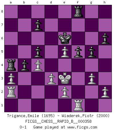 Last move : 0-1 2021 March 23 10:24:21 [Event "FICGS__CHESS__RAPID_B__000358"] [Site "FICGS"] [Date "2021.03.09"] [Round "1"] [White "Trigance,Emile"] [Black "Wiaderek,Piotr"] [Result "0-1"] [WhiteElo "1695"] [BlackElo "2000"] 1.c4 e5 2.Nc3 Nf6 3.Nf3 Nc6 4.g3 Nd4 5.Bg2 Nxf3+ 6.Bxf3 Bb4 7.Qb3 a5 8.O-O Bc5 9.d3 O-O 10.Bg5 h6 11.Bxf6 Qxf6 12.Ne4 Qe7 13.Nxc5 Qxc5 14.Qc3 d6 15.a3 a4 16.b4 axb3 17.Qxb3 Ra7 18.Qb4 b6 19.Qxc5 dxc5 20.Bc6 Bh3 21.Bg2 Bxg2 22.Kxg2 f6 23.Ra2 Ra4 24.Kf3 Kf7 25.Ke4 Ke6 26.f4 b5 27.fxe5 f5+ 28.Kf4 g5+ 29.Ke3 b4 0-1 English Opening Kingside Castling by player White (move 8) Kingside Castling by player Black (move 9) Player Black won this chess game. Follow this game move after move (download)Checkers is for tramps. (Paul Morphy) Um sich vor der Gefahr einer Erkältung zu schützen, sorge der wanderlustige König beizeiten für ein brauchbares Versteck. (Aaron Nimzowitsch) Solo el jugador con la iniciativa tiene el derecho a atacar. (Wilhelm Steinitz) Le système Elo représente seulement une moyenne. Il est simplement un indicateur de votre stabilité. (Anatoli Karpov) The right perception of any matter and a misunderstanding of the same matter do not wholly exclude each other. (Kafka's the trial)