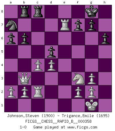Last move : 1-0 2021 April 15 17:26:51 [Event "FICGS__CHESS__RAPID_B__000358"] [Site "FICGS"] [Date "2021.03.09"] [Round "1"] [White "Johnson,Steven"] [Black "Trigance,Emile"] [Result "1-0"] [WhiteElo "1900"] [BlackElo "1695"] 1.d4 d5 2.Nc3 Nf6 3.Bf4 Bf5 4.Nf3 h6 5.e3 e6 6.Bd3 Bxd3 7.cxd3 Nc6 8.Rc1 Bd6 9.Qb3 Rb8 10.Bg3 Bxg3 11.hxg3 a6 12.Na4 Nd7 13.O-O O-O 14.Rfe1 Qe7 15.Rc2 Rfc8 16.Nc5 Nxc5 17.Rxc5 Na7 18.e4 b6 19.Rc2 c5 20.exd5 c4 21.dxc4 exd5 22.Rxe7 1-0 Queen's pawn : Chigorin variation Kingside Castling by player White (move 13) Kingside Castling by player Black (move 13) Player White won this chess game. Follow this game move after move (download)With or without the title, Bobby Fischer was unquestionably the greatest player of his time. (Burt Hochberg) Computer sind die einzigen Gegner, die nicht immer eine Ausrede auf Lager haben, wenn sie gegen mich verlieren. (Robert James Fischer) El Ajedrez es imaginación. (David Bronstein) J'ai toujours senti une vague pitié pour l'homme qui ne connaît rien aux échecs, tout comme j'en aurais pour un homme ignorant de l'amour. Les Echecs, comme la musique ou comme l'amour, ont le pouvoir de rendre heureux. (Siegbert Tarrasch) As a goal marker shodan is important. As a destination it is a poor place to stop. (Thomas Tamayo)