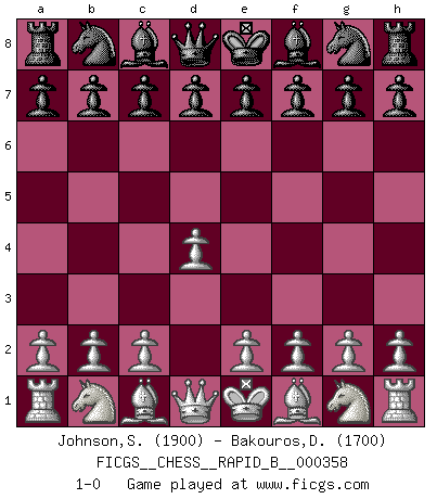 Last move : 1-0 2021 April 9 8:48:6 [Event "FICGS__CHESS__RAPID_B__000358"] [Site "FICGS"] [Date "2021.03.09"] [Round "1"] [White "Johnson,Steven"] [Black "Bakouros,Dimitris"] [Result "1-0"] [WhiteElo "1900"] [BlackElo "1700"] 1.d4 1-0 This chess game has been lost on time (started : 2021.03.09 20:5:38) Queen's pawn Player White won this chess game. Follow this game move after move (download)Chess is so inspiring that I do not believe a good player is capable of having an evil thought during the game. (Wilhelm Steinitz) Es hat in meinem Leben Zeiten gegeben, in denen das Schachspiel, wenn nicht zum Lebenszweck, so doch zu einem regelrechten Lebensersatz geworden ist. Man fühlt sich in solchen Zeiten nicht so, als besäße man eine göttliche Gabe, sondern eher so, als sei man von ihr besessen. (Garry Kasparov) EL Ajedrez es como la vida. (Boris Spassky) La victoire dans une partie d'Echecs appartient la plupart du temps à celui qui voit un peu plus loin que l'adversaire. (Lasker) Go and wake up your luck. (Persian saying)