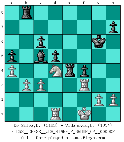 Last move : 0-1 2007 October 13 6:33:43 [Event "FICGS__CHESS__WCH_STAGE_2_GROUP_02__000002"] [Site "FICGS"] [Date "2007.07.11"] [Round "1"] [White "De Silva,Dinesh"] [Black "Vidanovic,Djordje"] [Result "0-1"] [WhiteElo "2183"] [BlackElo "1994"] 1.e4 c5 2.Nc3 d6 3.Nf3 e5 4.Bc4 Be7 5.d3 Nf6 6.Bg5 O-O 7.Bxf6 Bxf6 8.Nd5 Nd7 9.c3 Rb8 10.a4 Nb6 11.Ne3 a5 12.O-O Bd7 13.Qb3 g6 14.Bd5 Qc7 15.Nd2 Kg7 16.Ndc4 Bd8 17.Nxb6 Qxb6 18.Qxb6 Bxb6 19.b3 f5 20.exf5 gxf5 21.Nc4 Bc7 22.f4 Kg6 23.Rf3 exf4 24.Rxf4 Bc6 25.Ne3 Rbe8 26.Rf3 f4 27.Raf1 Kg7 28.Bxc6 bxc6 29.Nc2 d5 30.d4 Bd6 31.dxc5 Bxc5+ 32.Nd4 Re4 33.Rd1 Rb8 34.Kf1 Kg6 0-1 This chess game has been lost on time (started : 2007.07.11 18:37:4) Sicilian : Closed Kingside Castling by player Black (move 6) Kingside Castling by player White (move 12) Player Black won this chess game. Follow this game move after move (download)Later, I began to succeed in decisive games. Perhaps because I realized a very simple truth: not only was I worried, but also my opponent. (Mikhail Tal) Es liegt in der Natur, vernüftig zu denken und unlogisch zu handeln. (Anatole France) La esencia del Ajedrez es pensar acerca de lo que el Ajedrez es. (David Bronstein) Botvinnik disait en comparant les échecs à la musique: Il existe une science dont le but est l'étude de l'acoustique et des sons. Mais il y a aussi un art qui se sert de l'océan des sons : c'est la musique. De toute évidence, il en est de même pour la pensée. La logique est l'étude des lois de la réflexion et les échecs reflètent, en tant qu'art, le côté logique de la réflexion, sous la forme d'images artistiques... Extrait de Fischer - Spassky, Reykjavik 1972 par Alexander & F. Wyndham (Ed. Solar), p 37. All maxims have their antagonist maxims; proverbs should be sold in pairs, a single one being but a half truth. (William Mathews)