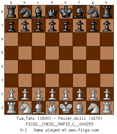 Last move : 0-1 2021 April 9 8:48:6 [Event "FICGS__CHESS__RAPID_C__000259"] [Site "FICGS"] [Date "2021.03.10"] [Round "1"] [White "Tua,Tahi"] [Black "Pelzer,Willi"] [Result "0-1"] [WhiteElo "1500"] [BlackElo "1670"] 0-1 This chess game has been lost on time (started : 2021.03.10 1:40:24) Player Black won this chess game. Follow this game move after move (download)If cunning alone were needed to excel, women would be the best Chess players. (Albin) Zeige mir drei Eröffnungsvarianten und ich beweise dir, dass zwei davon inkorrekt sind. (Emanuel Lasker) El Ajedrez es despiadado: debes de estar preparado para matar gente. (Nigel Short) Les réformistes prétendent que les progrès de la théorie conduiront à la disparition des échecs, et qu'il faut, pour leur rendre vie, en remanier les règles. En réalité, qu'exprime cette affirmation? Le mépris de l'intuition, de l'imagination et de tous les autres éléments qui font des échecs un art. (Alexander Alekhine) Train yourself to let go of everything you fear to lose. (Master Yoda in Star Wars ep.3)