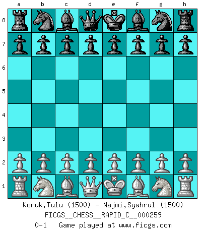 Last move : 0-1 2021 April 9 8:48:6 [Event "FICGS__CHESS__RAPID_C__000259"] [Site "FICGS"] [Date "2021.03.10"] [Round "1"] [White "Koruk,Tulu"] [Black "Najmi,Syahrul"] [Result "0-1"] [WhiteElo "1500"] [BlackElo "1500"] 0-1 This chess game has been lost on time (started : 2021.03.10 1:40:24) Player Black won this chess game. Follow this game move after move (download)Chess is in its essence a game, in its form an art, and in its execution a science. (Baron Tassilo) Die westlichen Werte sind eine Sprache, welche die Putin-Administration nicht versteht. (Garry Kasparov) El Ajedrez es como la guerra en un tablero. (Bobby Fischer) Vouloir jouer aux échecs contre soi-même est aussi paradoxal que vouloir marcher sur son ombre. (Stefan Zweig) Empty your mind, be formless, shapeless — like water. (Bruce Lee)
