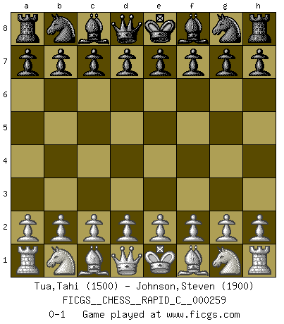 Last move : 0-1 2021 April 9 8:48:6 [Event "FICGS__CHESS__RAPID_C__000259"] [Site "FICGS"] [Date "2021.03.10"] [Round "1"] [White "Tua,Tahi"] [Black "Johnson,Steven"] [Result "0-1"] [WhiteElo "1500"] [BlackElo "1900"] 0-1 This chess game has been lost on time (started : 2021.03.10 1:40:24) Player Black won this chess game. Follow this game move after move (download)Only sissies Castle. (Rob Sillars) Ich könnte leicht behaupten: Ja,ja, Leonid Breschnew wollte nicht, daß ich Weltmeister werde. In der Tat war die Sache komplizierter. (Viktor Kortschnoi) Debemos de asegurarnos de que el Ajedrez no se convierta en un lenguaje muerto, muy interesante, pero tan solo para un grupo muy pequeño. (Sytze Faber) Des combinaisons [dans le jeu d'échecs] pareilles à des mélodies. Je crois entendre pour ainsi dire la musique des coups... (Vladimir Nabokov) Hold em is to stud what chess is to checkers. (Johnny Moss)