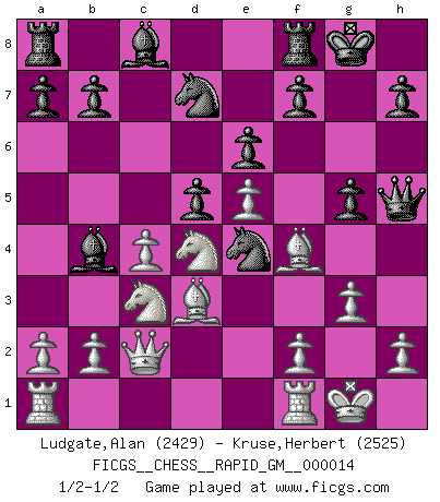 Last move : 1/2-1/2 2021 March 13 16:24:55 [Event "FICGS__CHESS__RAPID_GM__000014"] [Site "FICGS"] [Date "2021.03.13"] [Round "1"] [White "Ludgate,Alan"] [Black "Kruse,Herbert"] [Result "1/2-1/2"] [WhiteElo "2429"] [BlackElo "2525"] 1.d4 Nf6 2.c4 e6 3.Nc3 Bb4 4.Qc2 O-O 5.e4 d5 6.e5 Ne4 7.Bd3 c5 8.Nge2 cxd4 9.Nxd4 Nd7 10.Bf4 Qh4 11.g3 Qh5 12.O-O g5 1/2-1/2 Nimzo-Indian : Classical variation Kingside Castling by player Black (move 4) Kingside Castling by player White (move 12) This chess game ended in a draw. Follow this game move after move (download)The passion for playing Chess is one of the most unaccountable in the world. (H.G. Wells) Vielleicht wirkt die Aura früherer Spieler glanzvoller als die der heutigen Spieler, aber das liegt daran, dass man kein Programm wie Fritz hatte, das einem all die Löcher in ihren Partien zeigt. (Vladimir Kramnik) El Ajedrez es despiadado: debes de estar preparado para matar gente. (Nigel Short) Les erreurs sont comme les malheurs, elles n'arrivent jamais seules. (Siegbert Tarrasch) Computers have lots of memory but no imagination. (Anonymous)