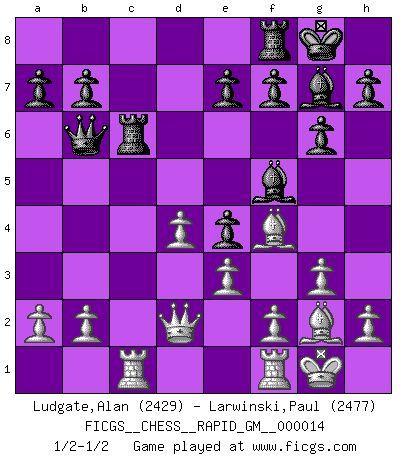 Last move : 1/2-1/2 2021 March 14 20:26:38 [Event "FICGS__CHESS__RAPID_GM__000014"] [Site "FICGS"] [Date "2021.03.13"] [Round "1"] [White "Ludgate,Alan"] [Black "Larwinski,Paul"] [Result "1/2-1/2"] [WhiteElo "2429"] [BlackElo "2477"] 1.d4 Nf6 2.c4 g6 3.Nf3 Bg7 4.g3 c6 5.Bg2 d5 6.cxd5 cxd5 7.Nc3 O-O 8.Ne5 Nc6 9.O-O Bf5 10.Bf4 Rc8 11.Rc1 Qb6 12.Nxc6 Rxc6 13.Qd2 Ne4 14.Nxe4 dxe4 15.e3 1/2-1/2 King's Indian, 3.Nf3 Kingside Castling by player Black (move 7) Kingside Castling by player White (move 9) This chess game ended in a draw. Follow this game move after move (download)Avoid the crowd. Do your own thinking independently. Be the Chess player, not the Chess piece. (Ralph Charell) Kein Großmeister ist normal. Sie unterscheiden sich nur im Ausmaß Ihrer Verrücktheit. (Viktor Kortschnoi) Con el tiempo, empecé a progresar en partidas decisivas. Tal vez porque me di cuenta de una simple verdad: no solo estaba yo nervioso sino también mi oponente. (Mikhail Tal) Demandez au pauvre Cg1 ce qu'il en pense. Eduard Gufeld à propos de la variante Saemisch de l'Est-Indienne. It is not enough to be a good player... you must also play well. (Siegbert Tarrasch)