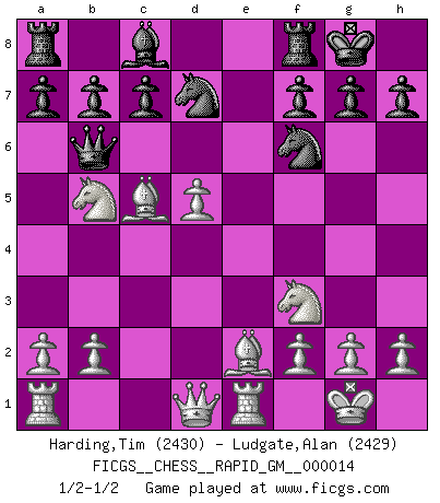 Last move : 1/2-1/2 2021 March 20 14:39:19 [Event "FICGS__CHESS__RAPID_GM__000014"] [Site "FICGS"] [Date "2021.03.13"] [Round "1"] [White "Harding,Tim"] [Black "Ludgate,Alan"] [Result "1/2-1/2"] [WhiteElo "2430"] [BlackElo "2429"] 1.e4 e5 2.Bc4 Nf6 3.d4 exd4 4.Nf3 d5 5.exd5 Bb4+ 6.c3 Qe7+ 7.Be2 dxc3 8.Nxc3 O-O 9.O-O Nbd7 10.Re1 Qd6 11.Nb5 Qb6 12.Be3 Bc5 13.Bxc5 1/2-1/2 Bishop's Opening : Urusov gambit, Panov variation Kingside Castling by player Black (move 8) Kingside Castling by player White (move 9) This chess game ended in a draw. Follow this game move after move (download)When you see a good move, look for a better one. (Emanuel Lasker) Später, ... hatte ich zunehmend Erfolg in entscheidenden Partien. Vielleicht weil ich eine einfache Wahrheit erkannte: nicht nur ich hatte Angst, auch mein Gegner. (Mikhail Nekhemyevich Tal) El Ajedrez es como la guerra en un tablero. (Bobby Fischer) Avant la finale, les dieux ont créé le milieu de partie. (Tarrasch) Nowadays, anyone who cannot speak English and is incapable of using the Internet is regarded as backward. (Al-Waleed bin Talal)