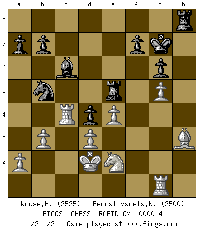 Last move : 1/2-1/2 2021 June 13 1:16:27 [Event "FICGS__CHESS__RAPID_GM__000014"] [Site "FICGS"] [Date "2021.03.13"] [Round "1"] [White "Kruse,Herbert"] [Black "Bernal Varela,Nelson"] [Result "1/2-1/2"] [WhiteElo "2525"] [BlackElo "2500"] 1.e4 c5 2.Nc3 Nc6 3.Nge2 Nd4 4.Nxd4 cxd4 5.Ne2 e5 6.c3 d5 7.cxd4 exd4 8.Qa4+ Qd7 9.Qxd7+ Bxd7 10.d3 Bc5 11.Bd2 Ne7 12.Rc1 Bb6 13.Nf4 Bc6 14.f3 O-O 15.Kd1 Rfe8 16.g4 Rad8 17.h4 Bc7 18.h5 g5 19.hxg6 hxg6 20.Ne2 Be5 21.Bf4 Bxf4 22.Nxf4 Kg7 23.g5 Nc8 24.b3 Nb6 25.Bh3 Na8 26.Kd2 Nc7 27.Ne2 dxe4 28.fxe4 Re5 29.Rhg1 Nb5 30.Rc4 Rh8 1/2-1/2 Sicilian : chameleon variation Kingside Castling by player Black (move 14) This chess game ended in a draw. Follow this game move after move (download)Bobby Fischer is the greatest Chess genius of all time ! (Alexander Kotov) Der Knackpunkt bei der Konzentration ist, daß wir nur durch sie etwas Neues und Ungewöhnliches am Schachbrett finden können. Sie ist der einzige Weg durch neue neue Ideen eine Überraschung zu bereiten. (Garry Kasparov) Yo no creo en la psicología. Yo creo en las buenas movidas. (Bobby Fischer) Donnez-moi un Cavalier en 6e et je gagnerais toutes mes parties. (Steinitz) I just play for fun. (Anna Kournikova)