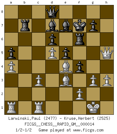 Last move : 1/2-1/2 2021 March 17 11:54:52 [Event "FICGS__CHESS__RAPID_GM__000014"] [Site "FICGS"] [Date "2021.03.13"] [Round "1"] [White "Larwinski,Paul"] [Black "Kruse,Herbert"] [Result "1/2-1/2"] [WhiteElo "2477"] [BlackElo "2525"] 1.e4 c5 2.Nf3 d6 3.d4 cxd4 4.Nxd4 Nf6 5.Nc3 a6 6.h3 e5 7.Nde2 h5 8.g3 Be7 9.Bg2 b5 10.Nd5 Nxd5 11.Qxd5 Ra7 12.Be3 Rb7 13.Qd2 Nd7 14.O-O O-O 15.Nc3 Nf6 16.Rfc1 Be6 17.a4 b4 18.Nd5 Nxd5 19.exd5 Bd7 20.Qe2 a5 21.Qxh5 f5 22.c4 bxc3 23.bxc3 f4 24.Be4 Rf6 25.Qh7+ Kf7 26.Qh5+ Kg8 27.Qh7+ Kf7 28.Qh5+ 1/2-1/2 Sicilian : Najdorf, Adams attack Kingside Castling by player White (move 14) Kingside Castling by player Black (move 14) This chess game ended in a draw. Follow this game move after move (download)Chess is above all, a fight ! (Emanuel Lasker) Das Schach ist nichts für kleine Geister, es beansprucht einen vollen Mann, der sich nicht sklavisch an das Überlieferte hält, sondern selbständig die Tiefen des Spiels zu ergründen sucht. (Wilhelm Steinitz) Me gusta decir que Bobby Fischer fue el mejor jugador que jamás haya existido. Pero lo que hizo de Fischer un genio, fue su habilidad de mezclar una frescura y pragmatismo Americano con ideas Rusas acerca de la estrategia. (Bruce Pandolfini) Lorsque vous vous retrouvez devant une position atroce, ne tendez pas un ultime piège dérisoire avec l'intention d'abandonner si l'adversaire le déjoue ! Faites-vous plutôt un devoir de résister comme si votre vie en dépendait. Jouez le coup qui vous déplairait au centuple si vous étiez dans la peau de votre tortionnaire ! Perfection is achieved, not when there is nothing more to add, but when there is nothing left to take away. (Antoine de Saint-Exupéry)