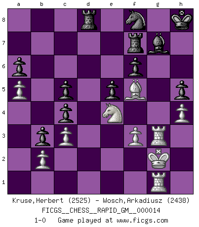 Last move : 1-0 2021 September 2 17:46:27 [Event "FICGS__CHESS__RAPID_GM__000014"] [Site "FICGS"] [Date "2021.03.13"] [Round "1"] [White "Kruse,Herbert"] [Black "Wosch,Arkadiusz"] [Result "1-0"] [WhiteElo "2525"] [BlackElo "2438"] 1.e4 e5 2.Nf3 Nc6 3.Bb5 a6 4.Ba4 Nf6 5.O-O Be7 6.Re1 b5 7.Bb3 d6 8.c3 O-O 9.h3 Nb8 10.d4 Nbd7 11.Nbd2 Bb7 12.Bc2 Re8 13.Nf1 Bf8 14.Ng3 g6 15.a4 c5 16.d5 c4 17.Bg5 Bg7 18.Nd2 Nc5 19.Qf3 h6 20.Be3 Qc7 21.Ngf1 Nfd7 22.g4 Nb6 23.a5 Nbd7 24.Ng3 Nf6 25.Rec1 Qe7 26.Kg2 Rf8 27.Rg1 Bc8 28.Rh1 Rb8 29.Rh2 Kh8 30.Kh1 Nh7 31.Qg2 Qh4 32.Rg1 Rb7 33.f3 Re8 34.Qf1 Kg8 35.Qc1 Bd7 36.Nf5 gxf5 37.gxf5 Qh5 38.Qe1 Kh8 39.Bxc5 dxc5 40.Bd1 f6 41.Rg6 Bxf5 42.exf5 Qxf5 43.Qe4 Qf4 44.Bc2 Rd8 45.Rhg2 Nf8 46.R6g4 Qxe4 47.Bxe4 Rf7 48.Kh2 R8d7 49.Bf5 Rxd5 50.Ne4 Rd3 51.R4g3 h5 52.h4 Rd5 53.Rg1 b4 54.Kg2 Rd3 55.Kh2 Rd8 56.Kh1 b3 57.Kg2 1-0 Ruy Lopez : Closed Kingside Castling by player White (move 5) Kingside Castling by player Black (move 8) Player White won this chess game. Follow this game move after move (download)The Pawns are the soul of the game. (Francois Andre Danican Philidor) Im Leben werden Partien nie so unstrittig gewonnen wie im Spiel (Emanuel Lasker) Por la belleza de sus partidas, la claridad de su juego y lo brillante de sus ideas, Fischer se creó el mismo como un artista de la misma estatura como Brahms, Rembrandt y Shakespeare. (David Levy) Psychologiquement, tu dois avoir confiance en toi même, mais cette confiance doit être basée sur des faits. (Robert Fischer) I can't decide which is riskier; taking crazy risks, or taking advice on crazy risks from a crazy risk taker. (Gregory House in House M.D.)