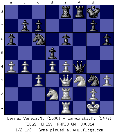 Last move : 1/2-1/2 2021 May 8 10:25:53 [Event "FICGS__CHESS__RAPID_GM__000014"] [Site "FICGS"] [Date "2021.03.13"] [Round "1"] [White "Bernal Varela,Nelson"] [Black "Larwinski,Paul"] [Result "1/2-1/2"] [WhiteElo "2500"] [BlackElo "2477"] 1.e4 e5 2.Nf3 Nc6 3.Bc4 Bc5 4.d3 Nf6 5.c3 a6 6.O-O d6 7.h3 O-O 8.a4 Be6 9.Bxe6 fxe6 10.b4 Ba7 11.Be3 Bxe3 12.fxe3 h6 13.Nbd2 Qe7 14.d4 exd4 15.exd4 Nh5 16.Qb3 Ng3 17.Rf2 Qf7 18.Qc4 d5 19.Qd3 Qf4 20.Re1 Rae8 21.Qe3 Nh5 22.Rfe2 Ng3 1/2-1/2 Giuoco Pianissimo Kingside Castling by player White (move 6) Kingside Castling by player Black (move 7) This chess game ended in a draw. Follow this game move after move (download)I have never in my life played the French Defence, which is the dullest of all openings. (Wilhelm Steinitz) Kann Schach nicht schließlich das Nationalspiel der Deutschen werden? Und welche weiteren Ausblicke bieten sich dann dar! Welche Hebung des allgemeinen Kultur-Niveaus, ja der Moral, wenn das Schachbrett den Kartentisch verdrängen würde! Wahrlich, ein Ziel, des Schweißes der Edlen wert! (Siegbert Tarrasch) ¿Que sería del Ajedrez sin errores graciosos?. (Kurt Richter) On entre au jeu d'Echecs comme on entre en Religion. Pour le joueur d'Echecs, la partie d'Echecs c'est l'office, la messe, le défilé du 1er Mai, le dépôt de gerbe au Monument aux Morts. C'est un drame sacré. (Michel Roos) See no evil, hear no evil, speak no evil. (The 3 monkeys)