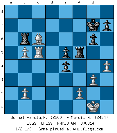 Last move : 1/2-1/2 2021 May 18 6:1:36 [Event "FICGS__CHESS__RAPID_GM__000014"] [Site "FICGS"] [Date "2021.03.13"] [Round "1"] [White "Bernal Varela,Nelson"] [Black "Marciz,Alexander"] [Result "1/2-1/2"] [WhiteElo "2500"] [BlackElo "2454"] 1.e4 c5 2.Nf3 Nc6 3.d4 cxd4 4.Nxd4 Nf6 5.Nc3 e5 6.Ndb5 d6 7.Bg5 a6 8.Na3 b5 9.Nd5 Be7 10.Bxf6 Bxf6 11.c3 Rb8 12.Nc2 Bg5 13.a4 bxa4 14.Ncb4 Nxb4 15.cxb4 Bd7 16.Bxa6 O-O 17.O-O Bc6 18.Rxa4 Bxa4 19.Qxa4 Kh8 20.Bb5 Qc8 21.Bc6 Bd8 22.b5 Bb6 23.Nxb6 Rxb6 24.Rd1 Qc7 25.h4 f5 26.Qa3 fxe4 27.Qxd6 Qxd6 28.Rxd6 g6 29.Rd5 Rf5 30.Rc5 Kg7 31.g3 1/2-1/2 Sicilian : Pelikan (Lasker/Sveshnikov) variation Kingside Castling by player Black (move 16) Kingside Castling by player White (move 17) This chess game ended in a draw. Follow this game move after move (download)First-class players lose to second-class players because second-class players sometimes play a first-class game. (Siegbert Tarrasch) Schach ist ein schwarz-weisser Dschungel. (Garry Kasparov) Tu cuerpo tiene que estar en óptima condición. Tu Ajedrez se deteriora como lo hace tu cuerpo. No puedes separar la mente y el cuerpo. (Bobby Fischer) Les Echecs ne sont pas pour les âmes timides. Ils requièrent un homme entier, qui ne s'arrête pas aveuglément à ce qui a été déjà établi, mais qui tente individuellement de sonder les profondeurs du jeu. (W. Steinitz) The Movers & Shakers of this world are those who play chess in the mornings and go to the disco in the evenings. (Dinesh De Silva)