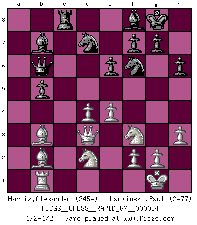 Last move : 1/2-1/2 2021 March 22 18:21:44 [Event "FICGS__CHESS__RAPID_GM__000014"] [Site "FICGS"] [Date "2021.03.13"] [Round "1"] [White "Marciz,Alexander"] [Black "Larwinski,Paul"] [Result "1/2-1/2"] [WhiteElo "2454"] [BlackElo "2477"] 1.d4 d5 2.Nf3 Nf6 3.c4 dxc4 4.e3 e6 5.Bxc4 c5 6.O-O a6 7.Bb3 b5 8.a4 Bb7 9.axb5 axb5 10.Rxa8 Bxa8 11.Qe2 c4 12.Bc2 Nbd7 13.b3 cxb3 14.Bxb3 Qb6 15.Bb2 Be7 16.Nbd2 O-O 17.Rc1 Bb7 18.e4 h6 19.Rb1 Rc8 20.h3 Bb4 21.Qd3 Bf8 1/2-1/2 Queen's pawn game Kingside Castling by player White (move 6) Kingside Castling by player Black (move 16) This chess game ended in a draw. Follow this game move after move (download)The battle for the ultimate truth will never be won. And that's why Chess is so fascinating. (Hans Kmoch) Wenn ich mich einlogge, glauben die Leute gewöhnlich nicht, dass ich es selbst bin und sie fangen an, mir dumme Fragen zu stellen. Und wenn sie es glauben, stellen sie wieder andere dumme Fragen. (Judith Polgar) El Ajedrez es de 30 a 40 por ciento psicología. Uno no cuenta con esto cuando se juega contra una computadora. No lo puedo confundir. (Judith Polgar) La victoire dans une partie d'Echecs appartient la plupart du temps à celui qui voit un peu plus loin que l'adversaire. (Lasker) Heh, heh, heh. Time to abandon ship. (General Grievous in Star Wars ep.3)