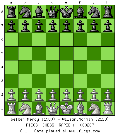 Last move : 0-1 2021 April 15 8:56:3 [Event "FICGS__CHESS__RAPID_A__000267"] [Site "FICGS"] [Date "2021.03.16"] [Round "1"] [White "Gelber,Mendy"] [Black "Wilson,Norman"] [Result "0-1"] [WhiteElo "1900"] [BlackElo "2129"] 0-1 This chess game has been lost on time (started : 2021.03.16 5:5:30) Player Black won this chess game. Follow this game move after move (download)Chess is a cold bath for the mind. (Sir John Simon) Ein Isolani verdüstert die Stimmung auf dem ganzen Schachbrett. (Savielly Grigorievitsch Tartakower) El Ajedrez es 99 por ciento táctica. (Teichmann) Même si l'adversaire joue le coup analysé précédemment, recommencez l'analyse en voyant la nouvelle position. Première règle de Blumenfeld Mac users swear by their computers. PC users swear at their computers. (Author unknown)