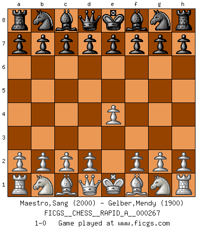 Last move : 1-0 2021 April 15 8:56:3 [Event "FICGS__CHESS__RAPID_A__000267"] [Site "FICGS"] [Date "2021.03.16"] [Round "1"] [White "Maestro,Sang"] [Black "Gelber,Mendy"] [Result "1-0"] [WhiteElo "2000"] [BlackElo "1900"] 1.e4 1-0 This chess game has been lost on time (started : 2021.03.16 5:5:30) King's pawn Opening Player White won this chess game. Follow this game move after move (download)Chess, like love, is infectious at any age. (Flohr) Den Ruhm habe ich schon, jetzt brauche ich noch das Geld. (Wilhelm Steinitz) Solo existe una cosa que Fischer hace en el Ajedrez sin placer: ¡perder!. (Boris Spassky) 'L'échange des dames est un coup dur pour les deux adversaires...' Un journaliste lors d'une partie du match Spassky-Fischer In fact if nothing is done against this teddy bear, hereby I announce that I would quit chess, rapid chess, blitz chess, postal chess, email chess, server chess and correspondence chess I will then switch to a table game where teddy bears aren't going to be seen for a while, like Poker, or Roulette, all 18+ games. (Elmer Valderrama)
