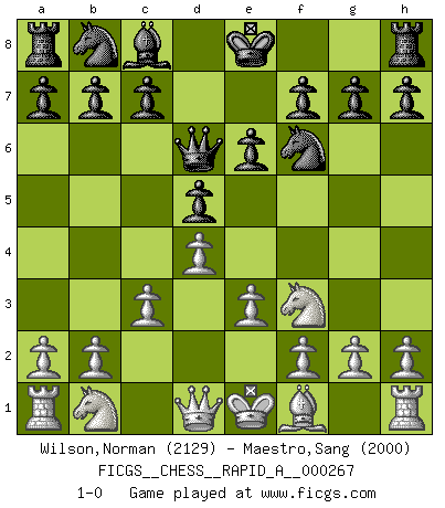 Last move : 1-0 2021 April 21 19:35:25 [Event "FICGS__CHESS__RAPID_A__000267"] [Site "FICGS"] [Date "2021.03.16"] [Round "1"] [White "Wilson,Norman"] [Black "Maestro,Sang"] [Result "1-0"] [WhiteElo "2129"] [BlackElo "2000"] 1.d4 Nf6 2.c3 d5 3.Bf4 e6 4.e3 Bd6 5.Bxd6 Qxd6 6.Nf3 1-0 This chess game has been lost on time (started : 2021.03.16 5:5:30) Queen's pawn game Player White won this chess game. Follow this game move after move (download)Before the endgame, the Gods have placed the middle game. (Siegbert Tarrasch) Ich verstehe mehr vom Schach als irgendein anderer lebender Meister. (José Raúl Capablanca) Mis oponentes también hacen buenas movidas. A veces yo no tomo esas cosas en consideración. (Bobby Fischer) Les pièces de l'échiquier étaient impitoyables. Elles le retenaient, elles l'absorbaient. Il y avait de l'horreur en cela, mais aussi une harmonie unique. Car, qu'y a-t-il dans le monde, à part les échecs ? (V. Nabokov) Philosophers use a language that is already deformed as though by shoes that are too tight. (Ludwig Wittgenstein)