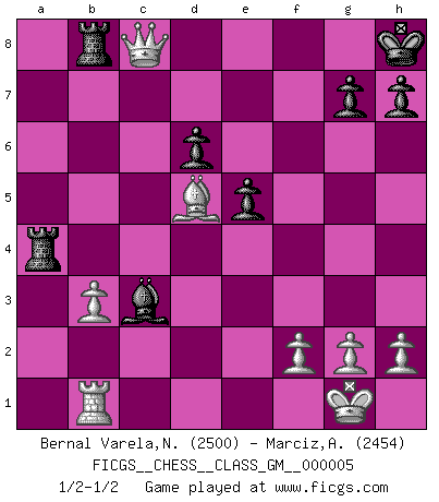 Last move : 1/2-1/2 2021 July 10 5:13:48 [Event "FICGS__CHESS__CLASS_GM__000005"] [Site "FICGS"] [Date "2021.03.16"] [Round "1"] [White "Bernal Varela,Nelson"] [Black "Marciz,Alexander"] [Result "1/2-1/2"] [WhiteElo "2500"] [BlackElo "2454"] 1.e4 c5 2.Nf3 Nc6 3.d4 cxd4 4.Nxd4 Nf6 5.Nc3 e5 6.Ndb5 d6 7.Bg5 a6 8.Na3 b5 9.Nd5 Be7 10.Bxf6 Bxf6 11.c3 Rb8 12.Nc2 Bg5 13.a4 bxa4 14.Ncb4 Nxb4 15.cxb4 Bd7 16.Bxa6 O-O 17.O-O Kh8 18.Qc2 Be6 19.Rxa4 f5 20.Bc4 Qc8 21.Qd3 fxe4 22.Qxe4 Bd2 23.b3 Bxd5 24.Bxd5 Rf4 25.Qe2 Rd4 26.Qf3 Bxb4 27.Rfa1 Rf4 28.Qg3 Rg4 29.Qh3 Bc3 30.Rb1 Rxa4 31.Qxc8+ 1/2-1/2 Sicilian : Pelikan (Lasker/Sveshnikov) variation Kingside Castling by player Black (move 16) Kingside Castling by player White (move 17) This chess game ended in a draw. Follow this game move after move (download)Examine moves that smite! A good eye for smites is far more important than a knowledge of strategical principles. (Purdy) Mein Gehirn das ist mein zweitwichtigstes Organ [Aus dem Film: Der Schläfer]. (Woody Allen) Una clavada es mas poderosa que una espada. (Fred Reinfeld) Toutes les manuvres exécutées sur une colonne ouverte ont pour but ultime l'intrusion définitive sur la septième ou la huitième rangée, en plein cur de la position ennemie. (Aaron Nimzovitch) Life is like internet, nothing interesting, but noone want to leave it. (Ilmars Cirulis)